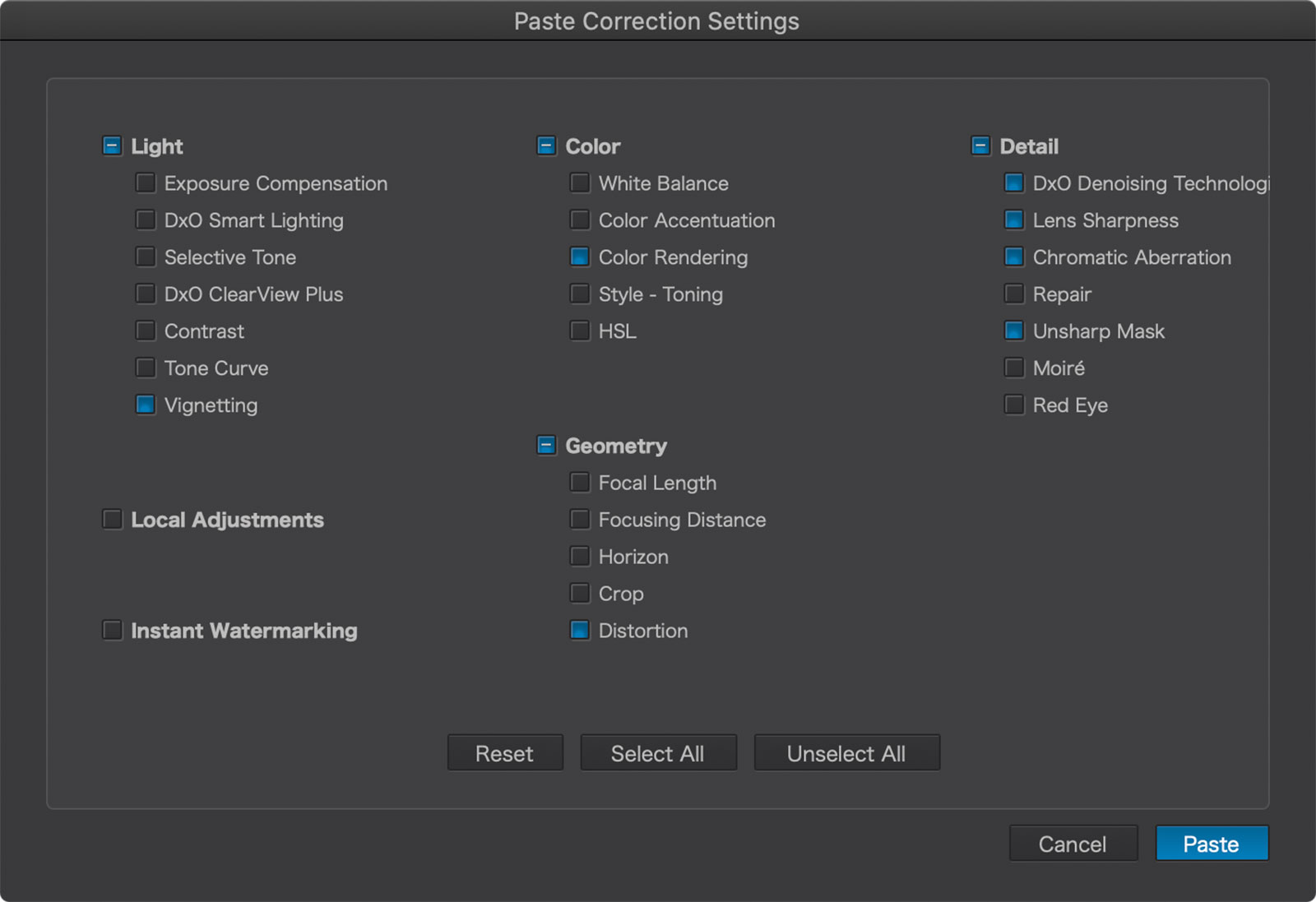 DxO PhotoLab 4 also adds the ability to selectively copy and paste settings. From the Photo Browser, users can select the specific edits, including lighting, color, detail, local adjustments, geometry or watermarking.