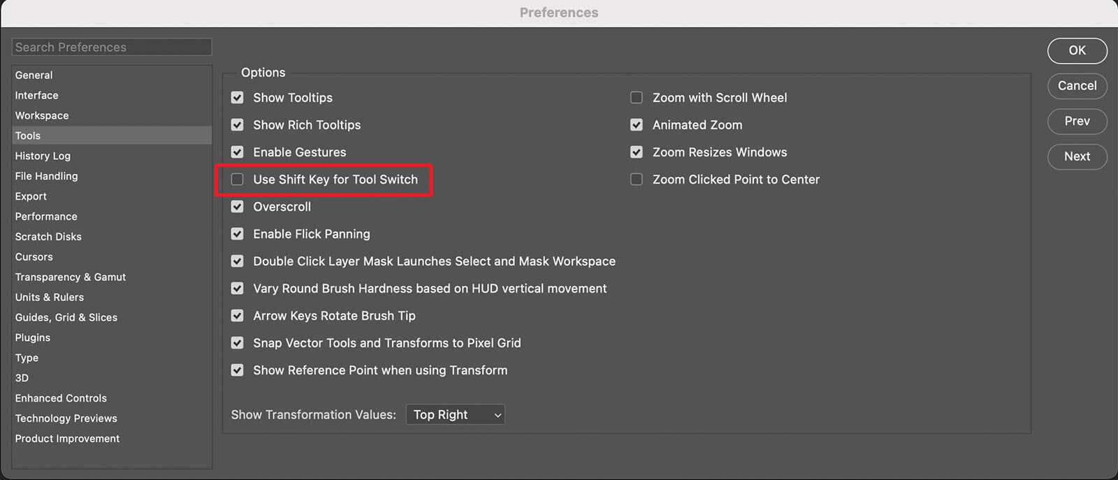 Power tip: If you don’t want to hold down the shift key to change tools, there’s a preference setting for that. Open Preferences (macOS: Photoshop > Preferences, Win: Help > Preferences) choose Tool and uncheck Use Shift Key for Tool Switch. Now any tool can be selected by hitting its letter key. So the Move tool keyboard shortcut is simply V.