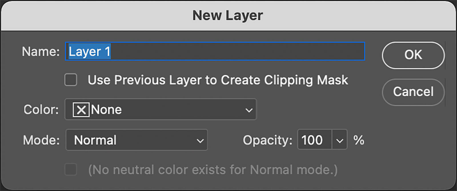 There are a few extras in this window. Beyond renaming (a really good habit to develop), you can clip it to the layer below it. This is useful for special effects. Here you can color a layer to make it stand out as part of similar layers. The Mode drop-down is for choosing the blending mode. If a neutral color works with a blending mode, checking the box fills the layer with that neutral color. The darken modes fill it with white, the lighten modes fill it with black and the overlay modes fill it with 50% gray.