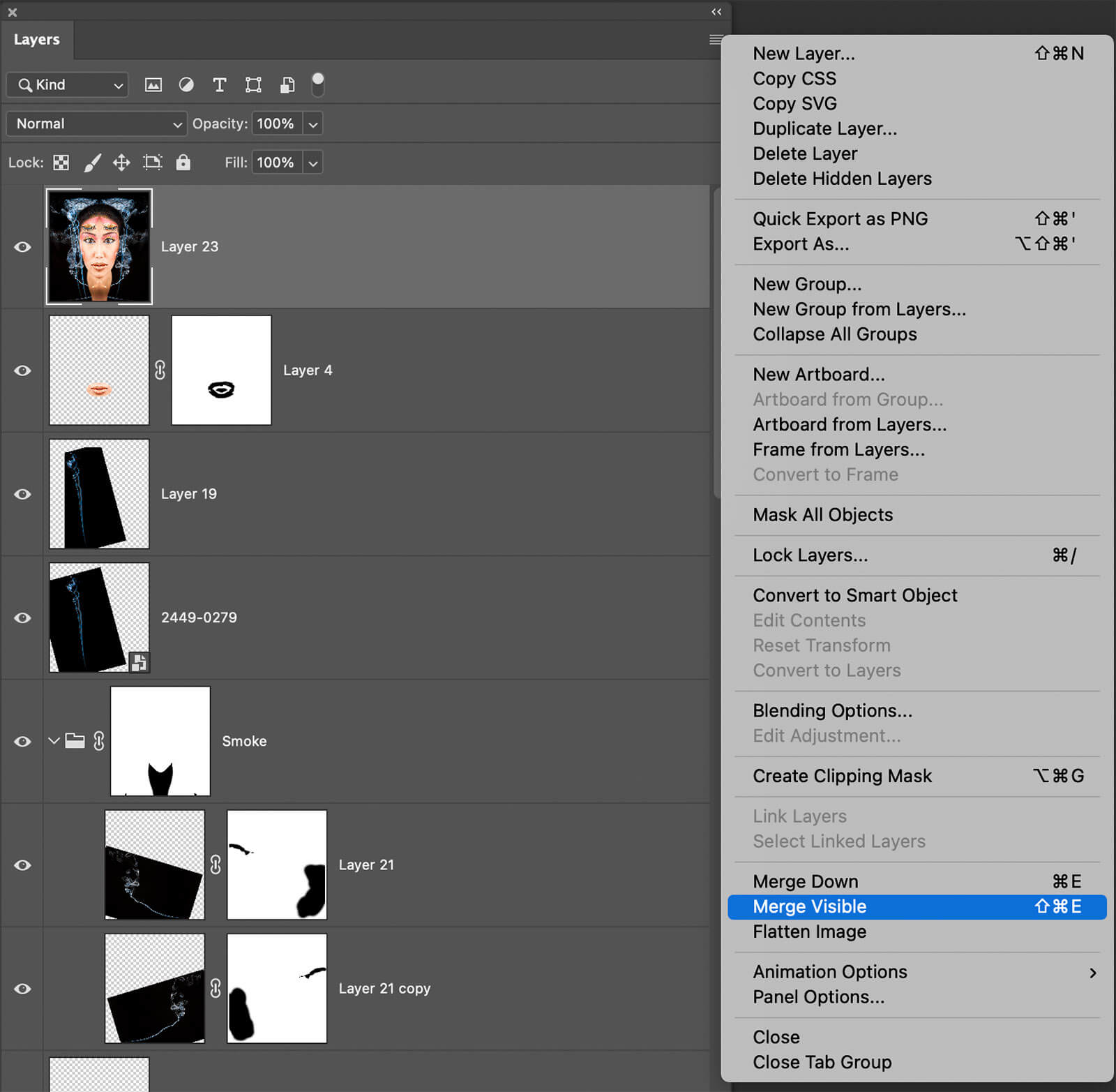 Copying all the layers below to a new one keeps all of them intact for future changes that you will eventually decide to make. You’ll be glad you learned this one. You can do this from the Layers menu by choosing Merge Visible and adding the Option (Win: Alt) key. Without Option (Win: Alt) the layers are flattened. Not good.