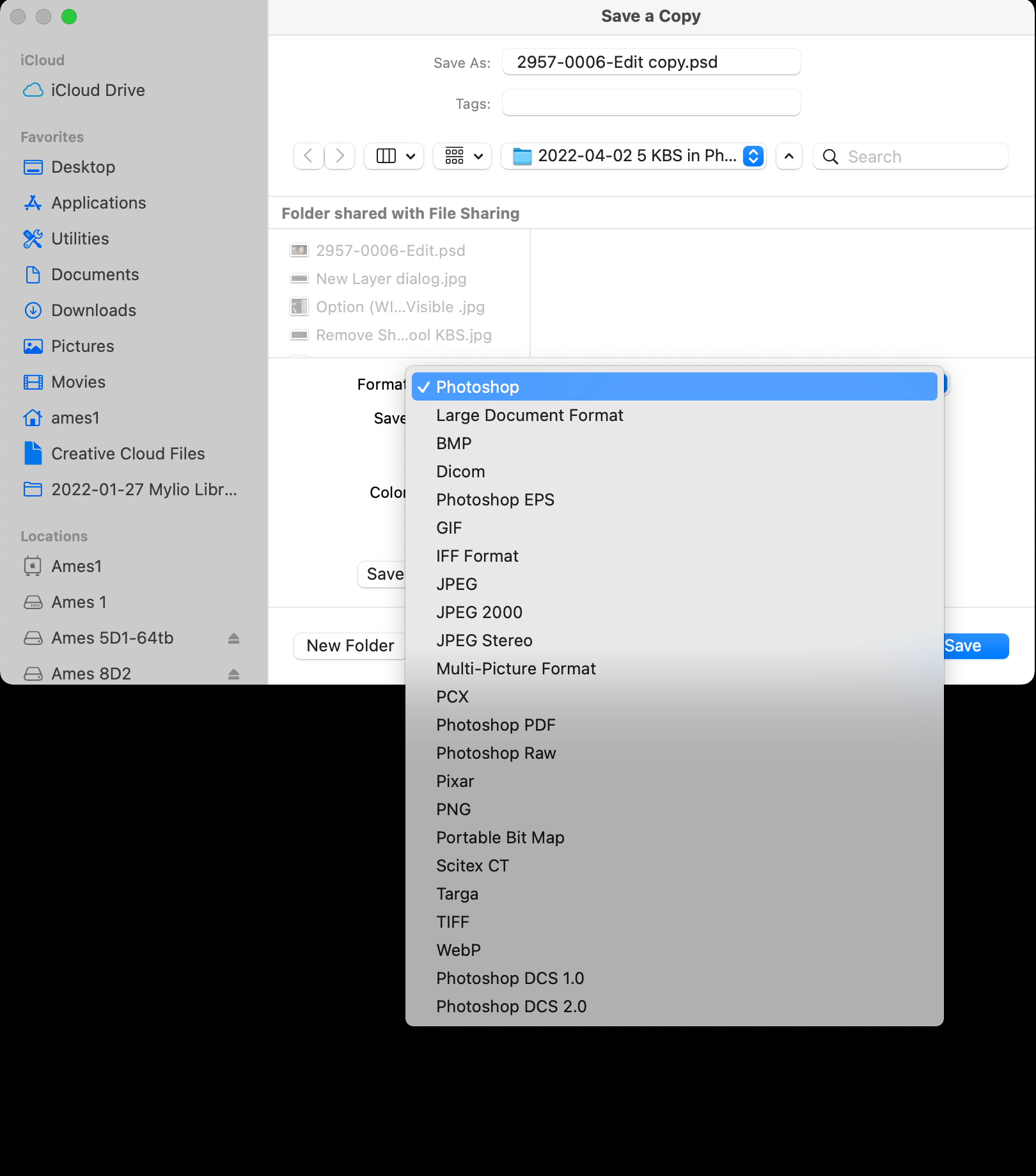 This shortcut opens the Save … window. There is a lot going on in it too. When a photo has multiple layers, there are only four options to save it: Photoshop (.psd), Large Document Format (.psb), Photoshop PDF (.pdf) or TIFF (.tif.)