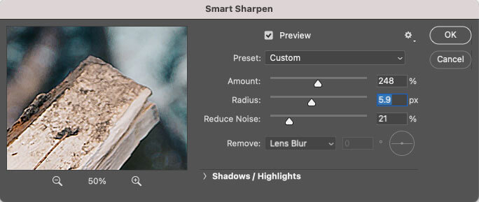 To get started, open the file in question and go to Filter > Sharpen > Smart Sharpen. Then position the image in the preview window so you can better see the area in question. From there, you can adjust the controls in the Sharpen section: