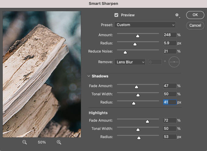 - Fade Amount: Adjusts the amount of sharpening in the highlights or shadows regions.