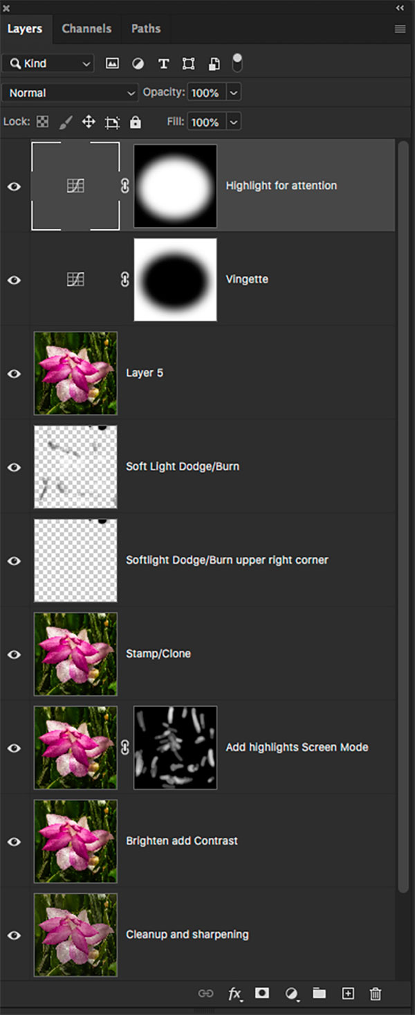 Once again I recommend creating a Merged Visible layer. To this I look for anything I’ve missed that takes attention away from my main subject. In this case there were some bright areas near the borders that need to attention. I used the Clone Tool to add detail to hot spots. Adding a final dodge and burn layer in Soft Light Mode finished the work.