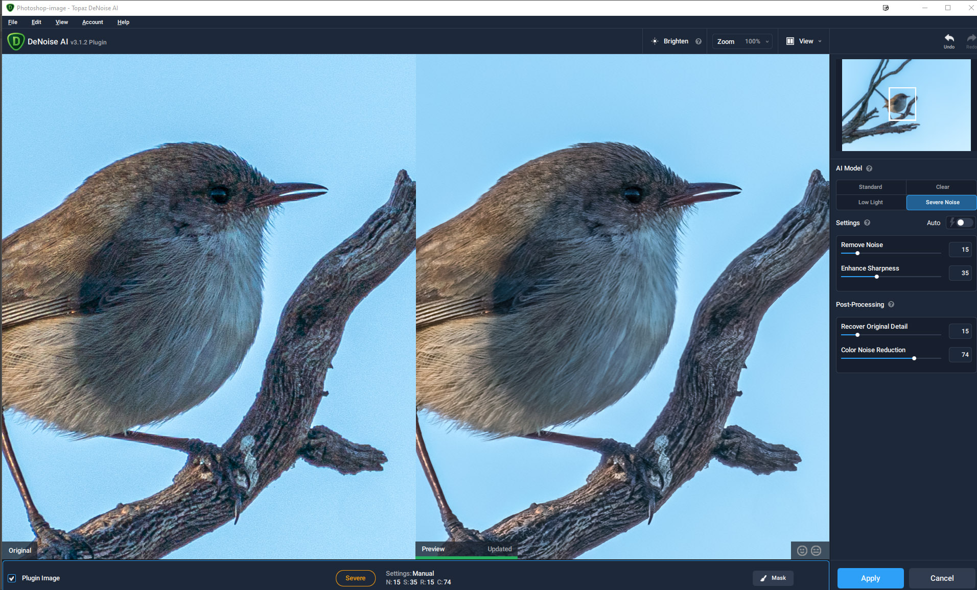 Using DeNoise AI can save a great shot and reduce the amount of noise considerably. You can try auto settings — I usually find Low Light is a terrific setting to use — but on this image I used the Severe Noise setting.