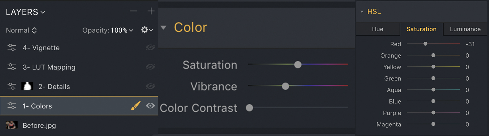 Details are very important in my sports photography. I want to see as much sweat/dirt/chalk as I can (without overdoing it of course)! On this second layer, I combined the HDR Enhance (Clarity / Smart Structure / Microstructure sliders) with the HDR Details boost filters. Then, I paint this whole layer straight on the athlete. There’s no need to add more definition to the background as I like it as blurry as possible to isolate my subject.