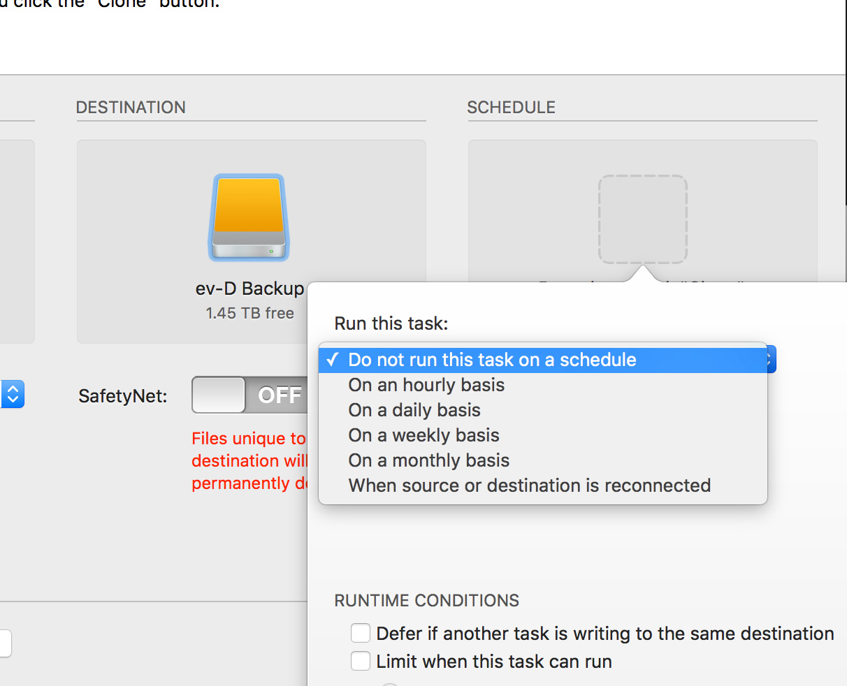 Select your destination drive. This is where your data is copied to. I like to toggle SafetyNet off. Essentially, SafetyNet is a feature where Carbon Copy Cloner keeps deleted files in case you accidentally deleted them and need to recover them later. It does take up a certain amount of space on your drive, which you can set. However, I like to toggle it off. When I mirror my drives, I expect them to be identical copies. With SafetyNet, they aren’t.
