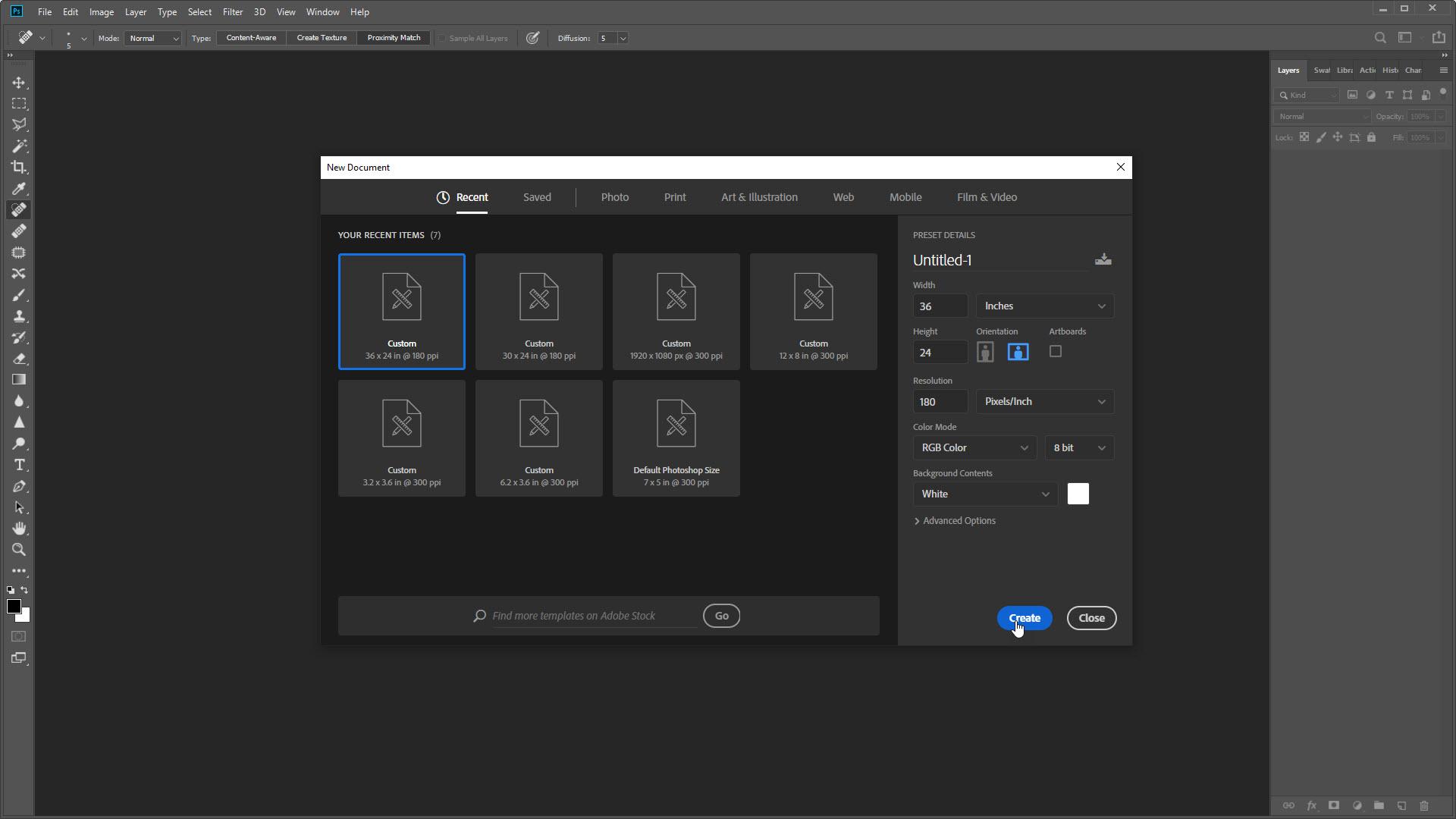 Click File > New. Set the width to 36 inches, height to 24 and PPI to 180. Click the Create button to create the new Photoshop document.