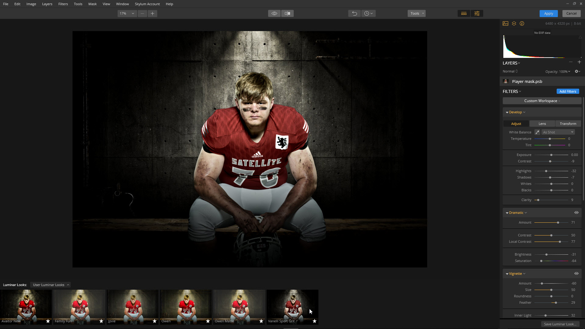 By using Photoshop’s Smart Object we were able to add Luminar Flex as a Smart Filter to create an editable football poster. Think how powerful this is. You could swap out the Football player with a different image and all the changes will automatically be applied to the new image.