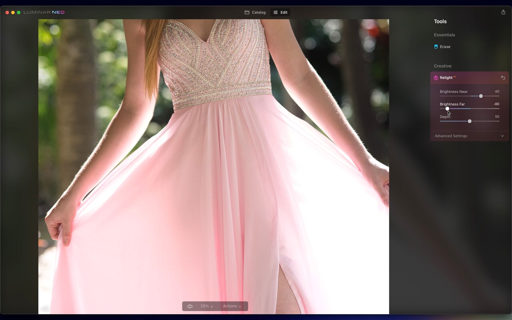 Look how much detail I was able to restore in the background by applying a negative value to Brightness Far. At the same time, I ensured the subject in the foreground was well lit using a positive value for Brightness Near. The Depth slider played an important role by balancing the light.