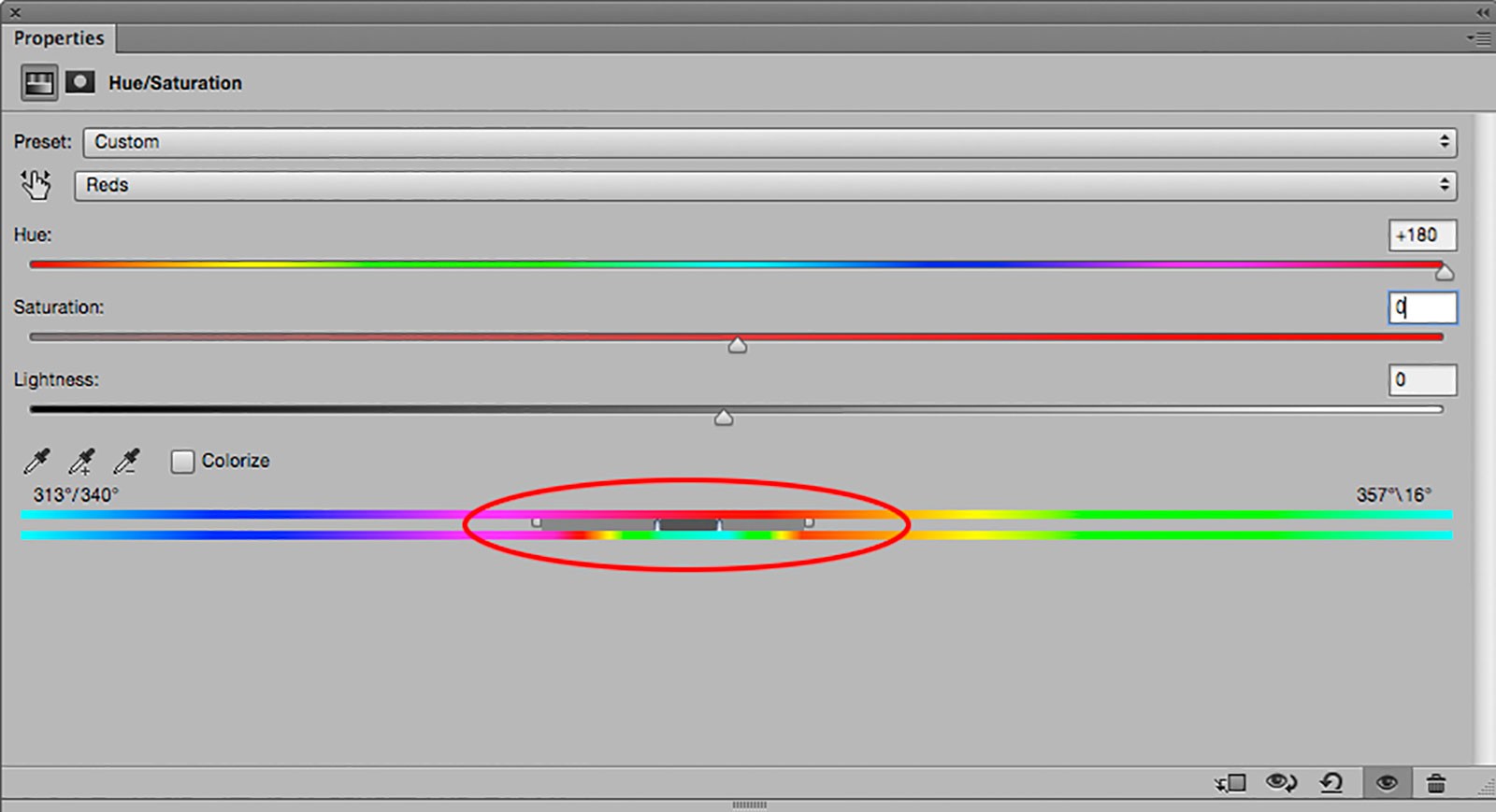 Once the photo is open in Photoshop, just add a Hue/Saturation Adjustment layer, then under the word Master choose the Reds preset. Because the blotches on his face are mostly red, it makes sense to start off with this range first. Notice the two rainbow colored strips in the lower part of the dialogue pictured here? (Just as a side note, when using this technique it really helps to enlarge the dialogue box for the Properties panel by grabbing the lower right corner of the panel and dragging it to the right, making it much easier to fine tune your adjustments.)