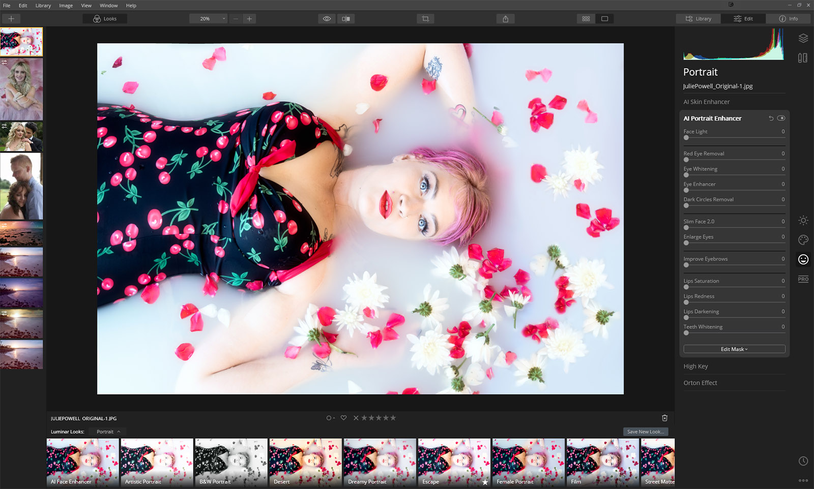 Then move over to the Portrait panel (with the smiley face). Here, adjust some of the sliders in the AI Skin Enhancer, AI Portrait Enhancer, High Key and Orton Effect tools. I created a little overview video below.