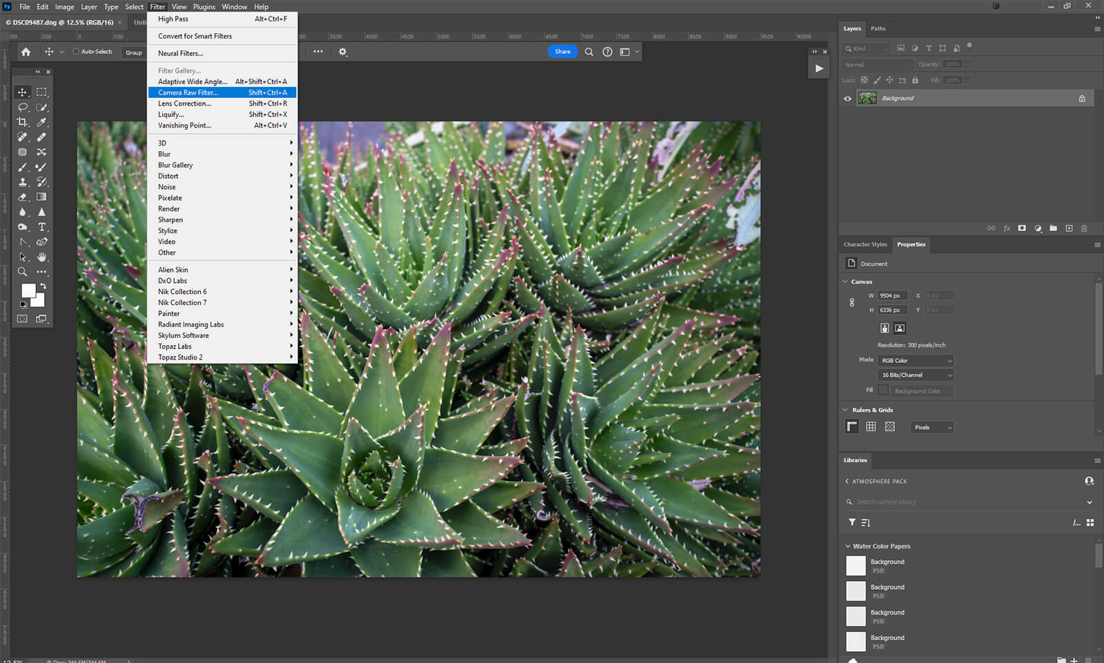 3. From the top menu, select Filter > Camera Raw Filter… or (Shift + Ctrl + A) to launch Adobe Camera Raw: