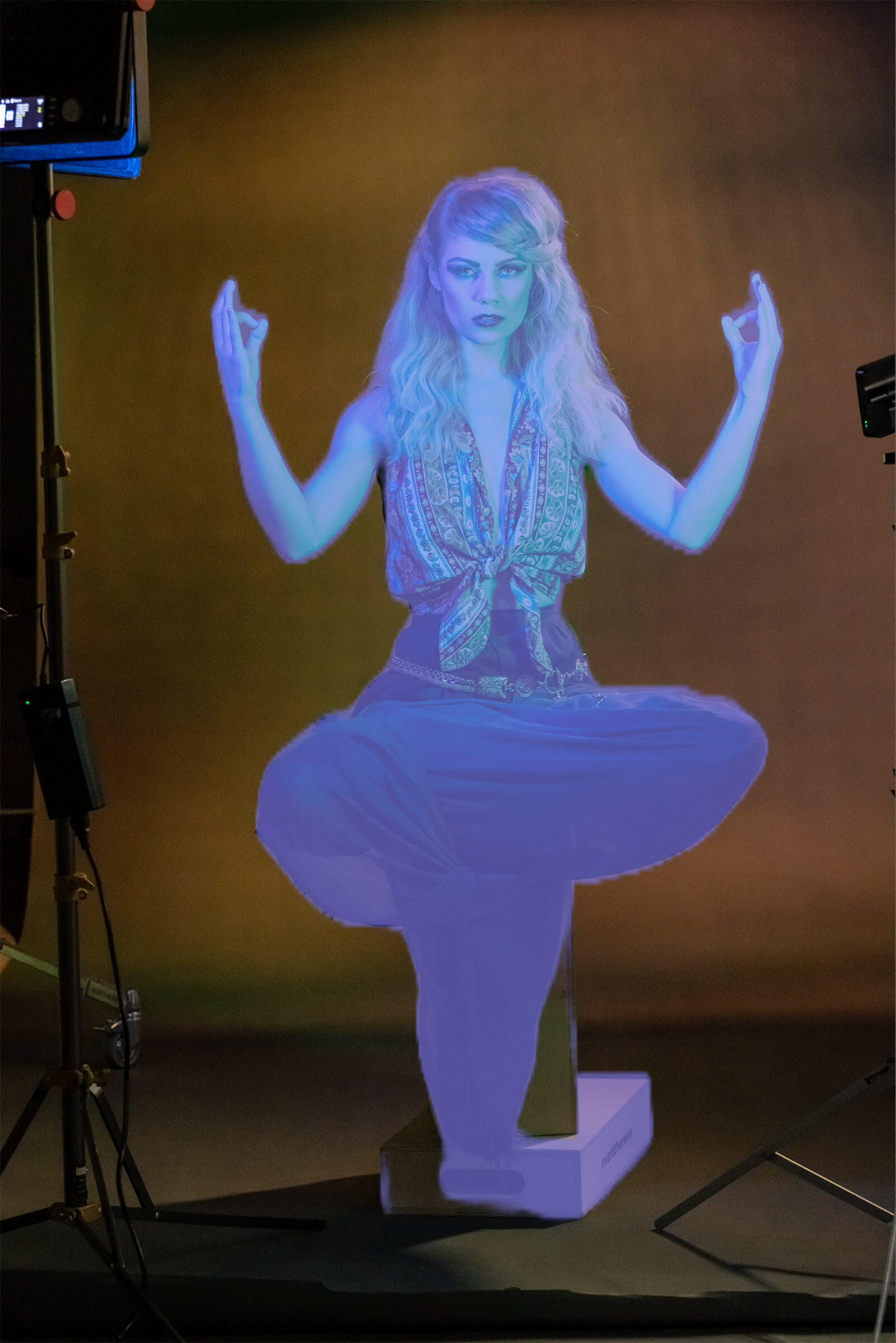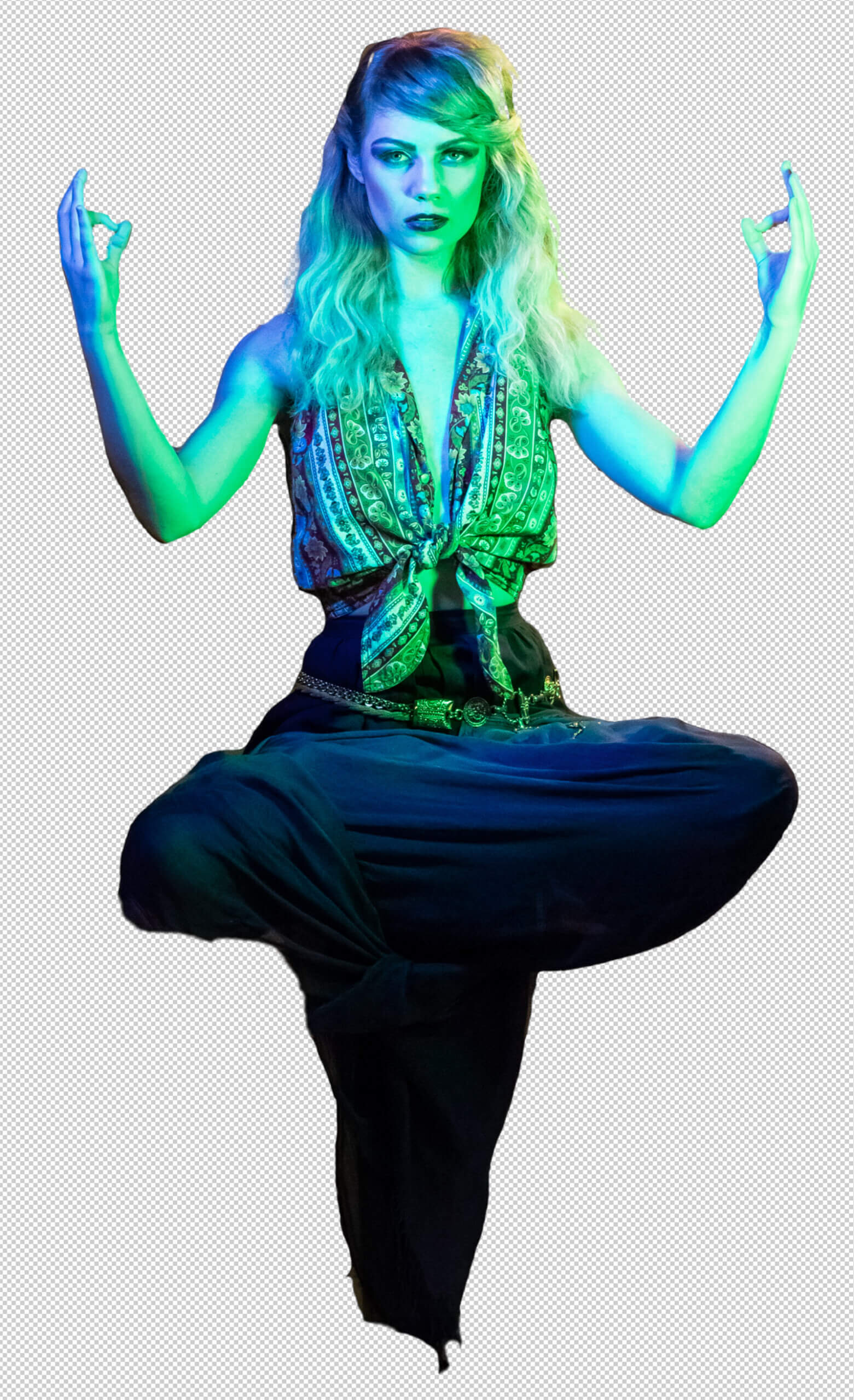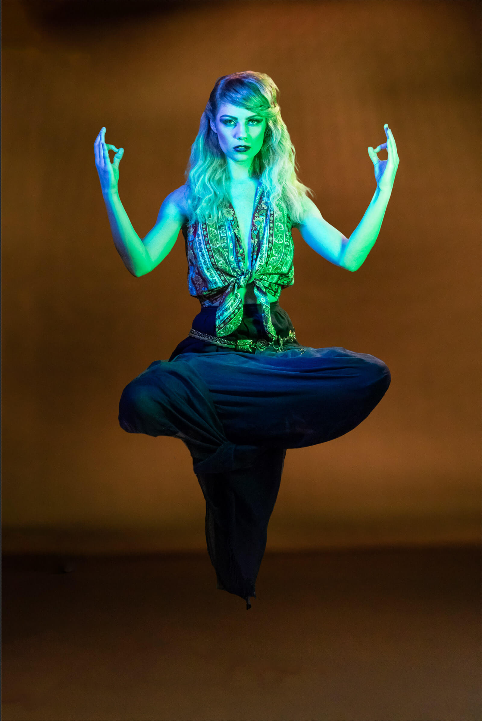 Floating a person without wire work is the realm of Photoshop. The setup is simple. I put a half-height apple box on the floor with a full-size apple box on top of it. Aria sat cross-legged on top of the stack. Her skirt dangled down but did not hit the floor. The boxes are removed in Photoshop to make her float above the floor.