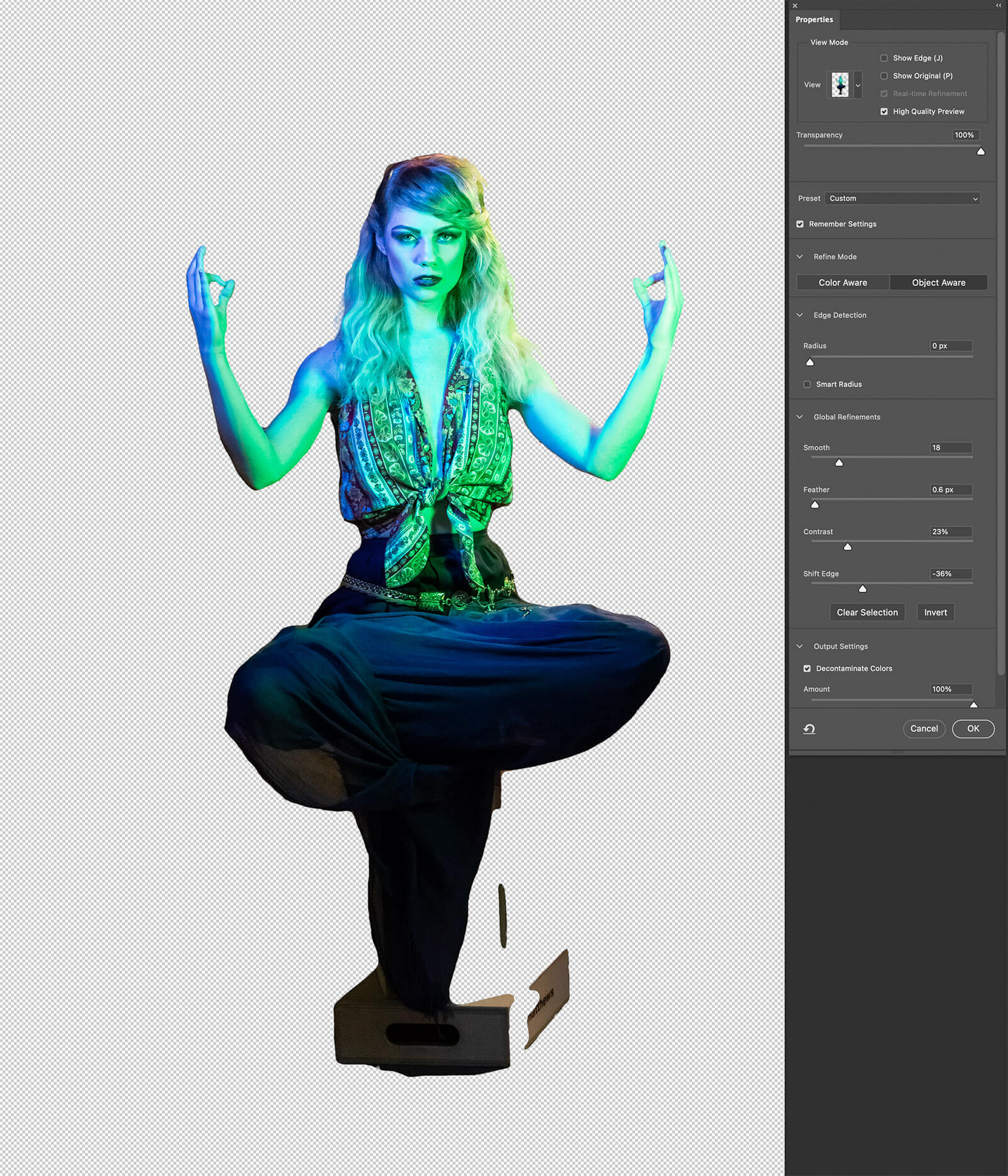 The selection shows as marching ants. Click Select and Mask. Aria, our mystic appears to be floating on a transparent background. Next, I click Refine Hair. The second tool down is the Refine Edge tool.