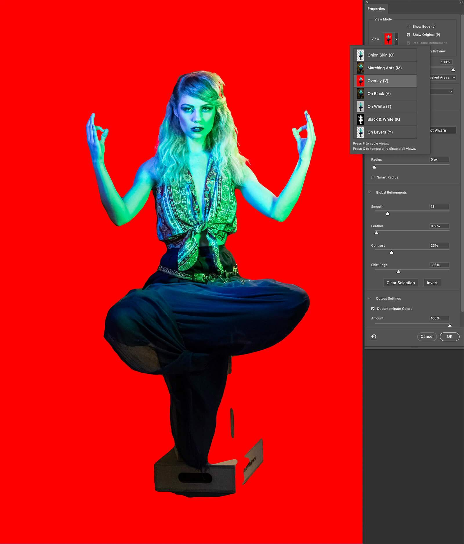 There are a bunch of flaws in the mask. Select Subject is a good starting point and it will always want tweaks. I clicked the View menu at the top to choose Overlay (V) to see the mystic against red.