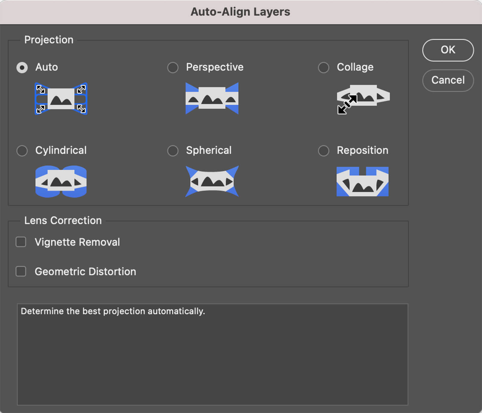 This brought the different frames into a sole Photoshop document, as separate layers. I selected each layer, then went up to Edit > Auto-Align Layers. This provided me with a few options for Projection. For my use case, the Auto setting was perfectly fine. I could have also checked to remove any vignetting or corrected any distortion, but I wasn’t worried about that for this.