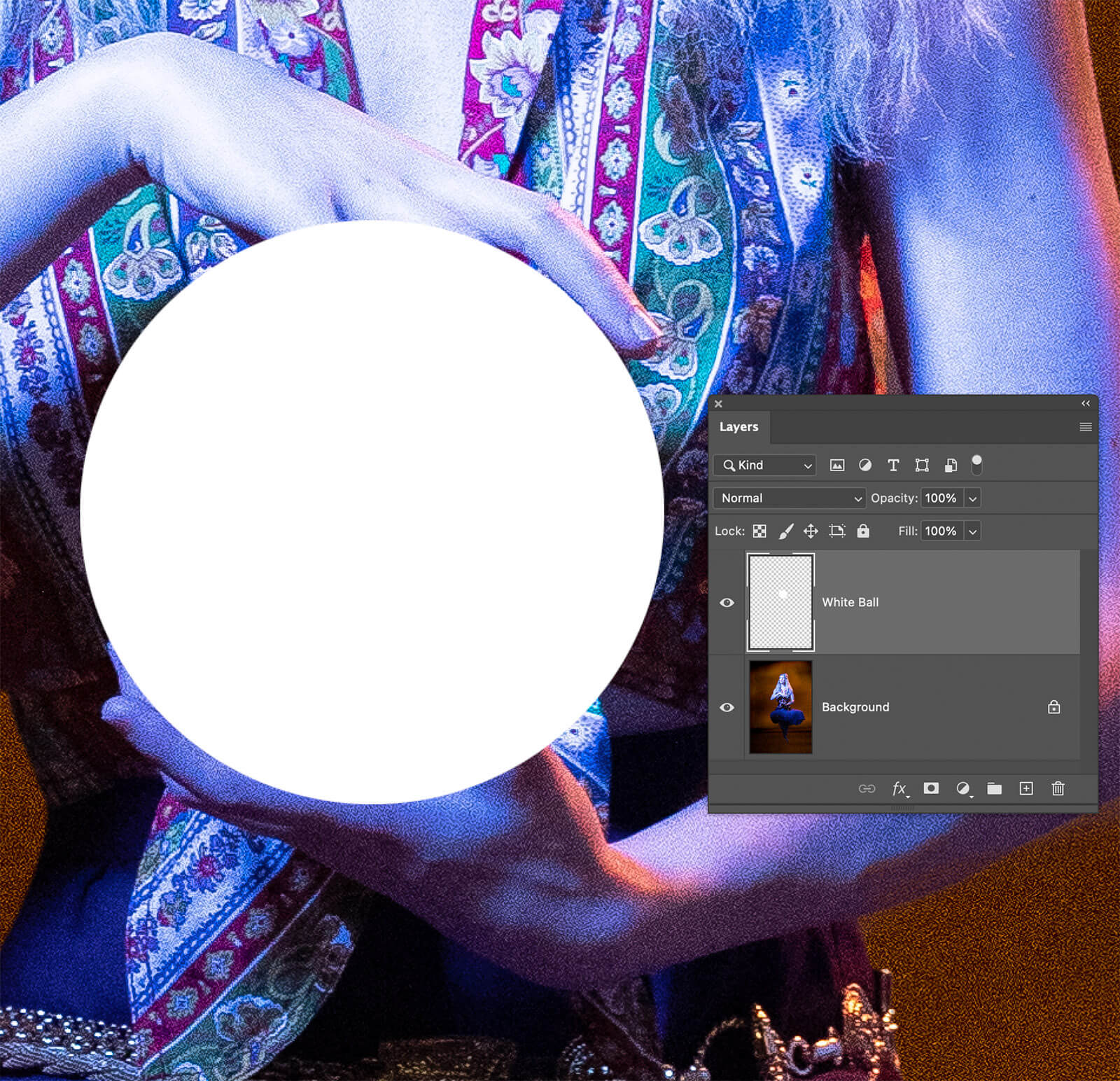 The glowing ball looks great but her fingers look like they are amputated. I Command (Win: Ctrl) clicked the White Ball layer to bring back the circular selection. Next, I highlighted the Background layer by clicking it then, made the selection into a new layer by typing Command + J (Win: Ctrl + J). I renamed it Fingers.