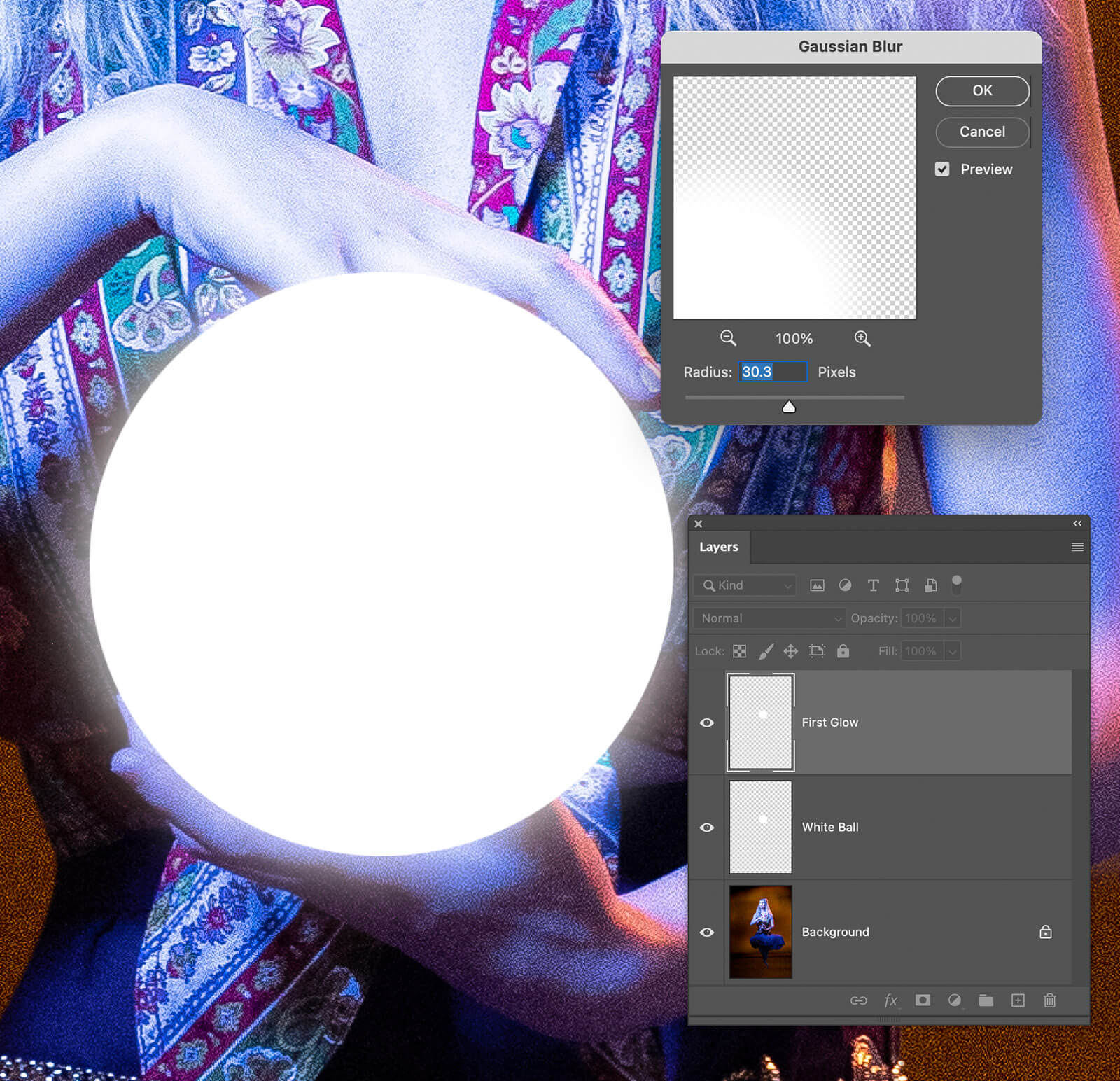 I went to the Filter menu and selected Blur > Gaussian Blur. I hovered the preview square cursor over an edge of the ball to see what it would look like as I moved the Radius slider to 30.3. This is not a formula. I did it by feel. When you make your glowing crystal your radius will be different.