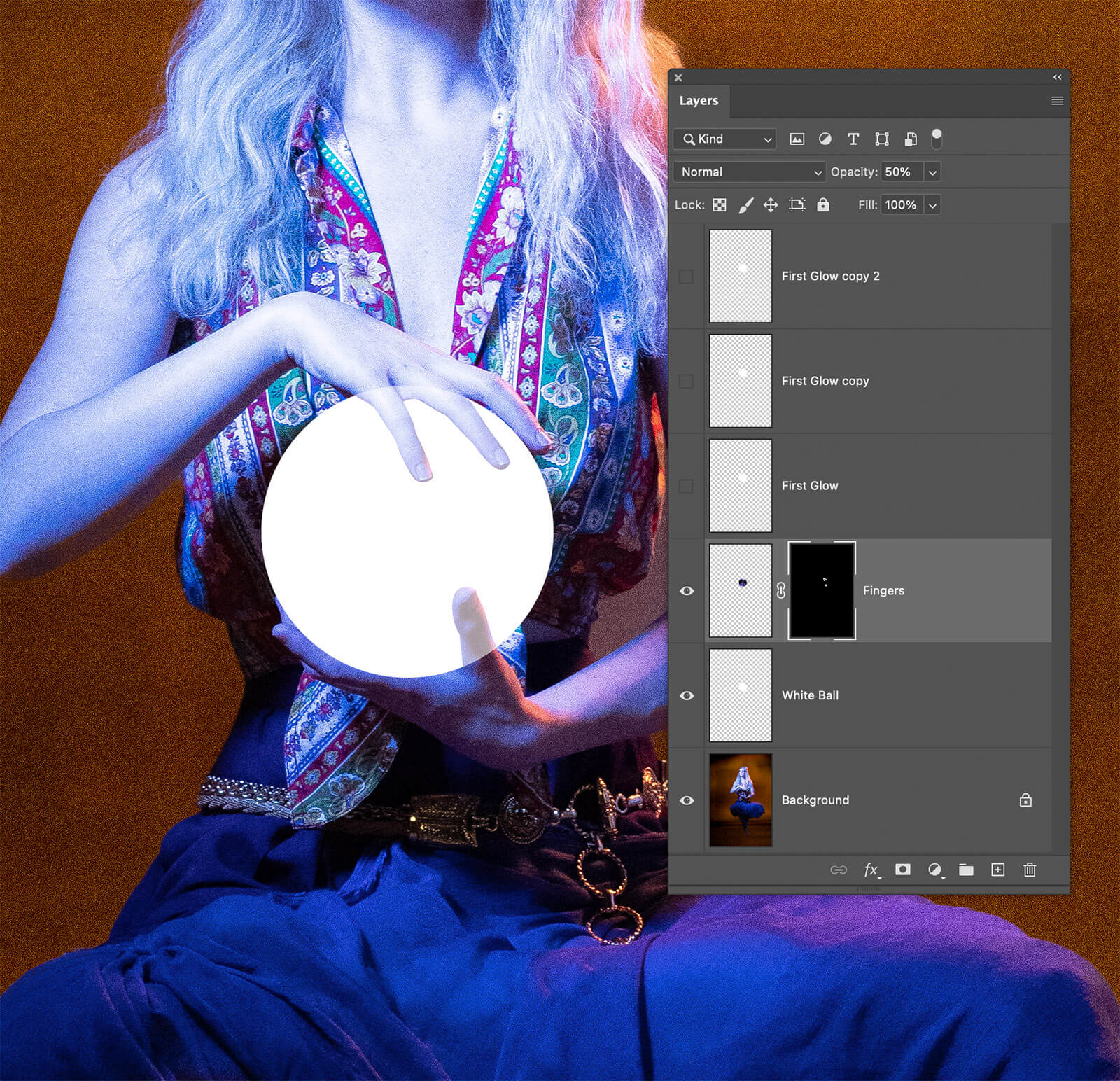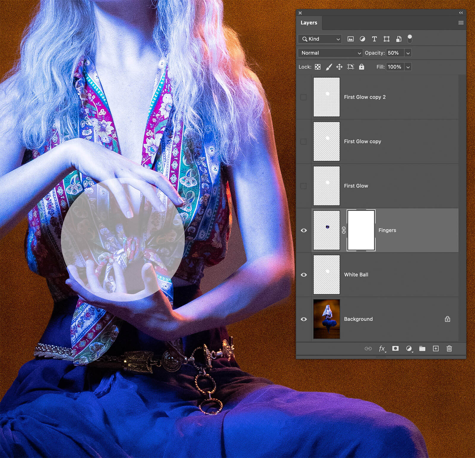 Next, I hid the three glow layers by clicking on their eye icons. Then, I dragged the Fingers layer above the White Ball layer and lowered its opacity to 50%. When the Move tool (V) is active, tap a number to set that as the opacity. 2 = 20%, 5 = 50%, etc.