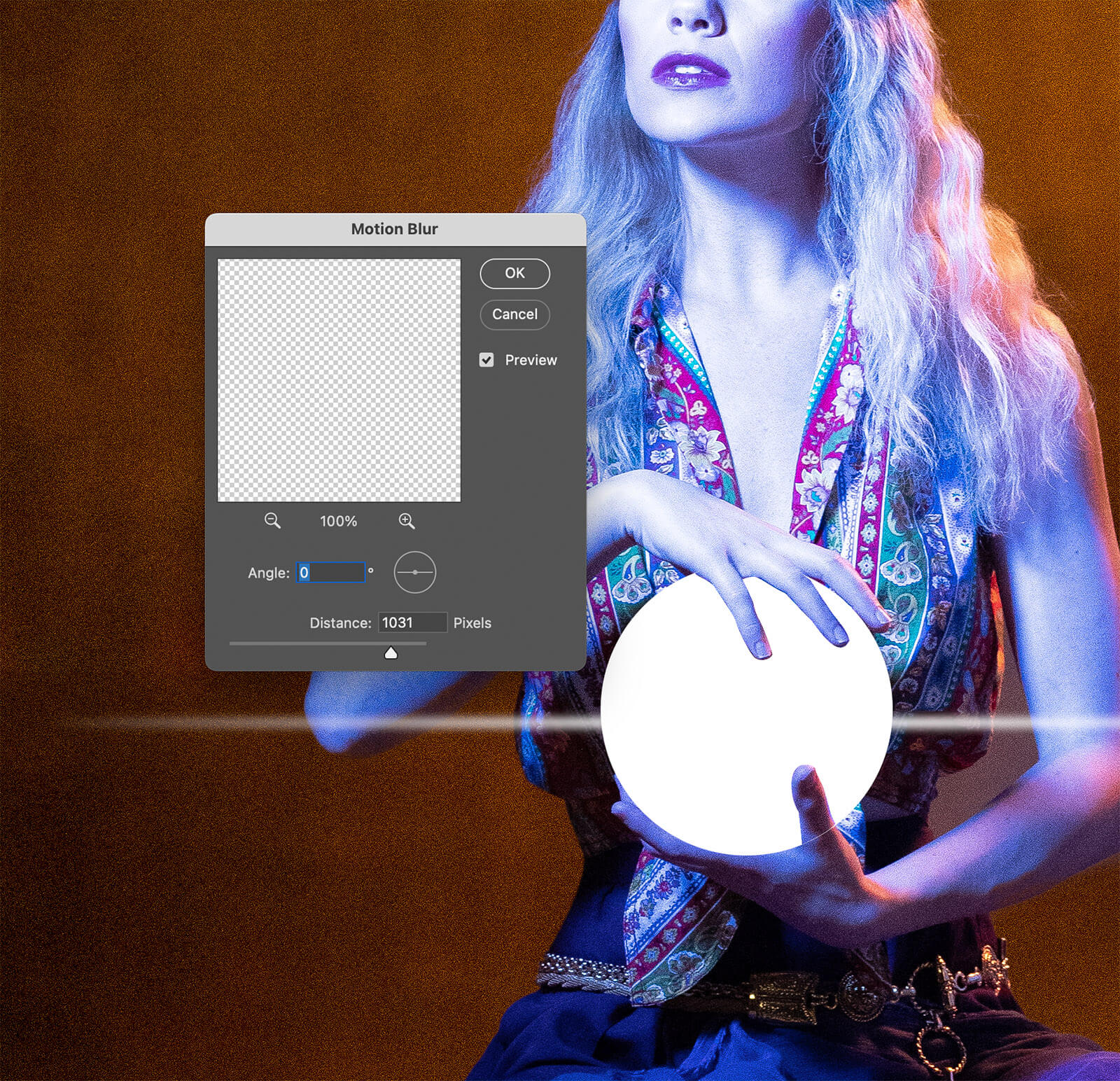 I used her hands as a guide to creating the magical orb. On a new layer labeled White Ball, I used the Elliptical Marquee tool to draw a circular selection.