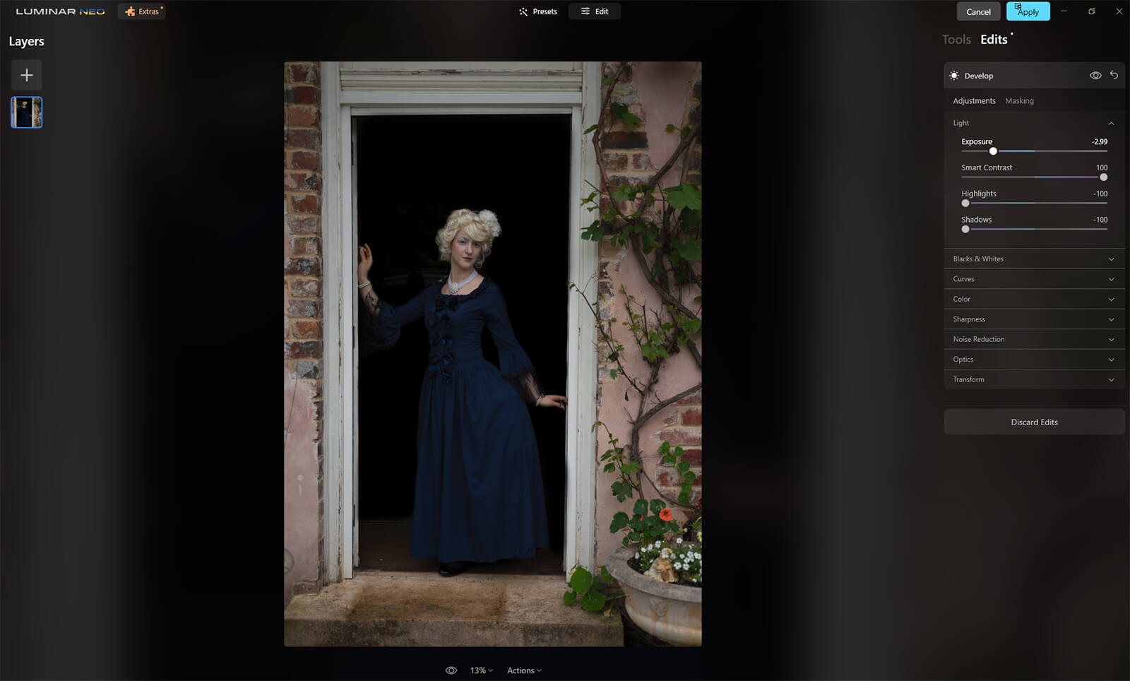 For pretty much any tool in Luminar Neo, there is a masking option. This allows you to brush in or out any part of a mask with that adjustment tool. I used the Develop tool in the Essentials panel. Carefully brushing in and out what I wish to darken, then it was a simple case of adjusting my exposure, highlights and shadows to darken down the area required.