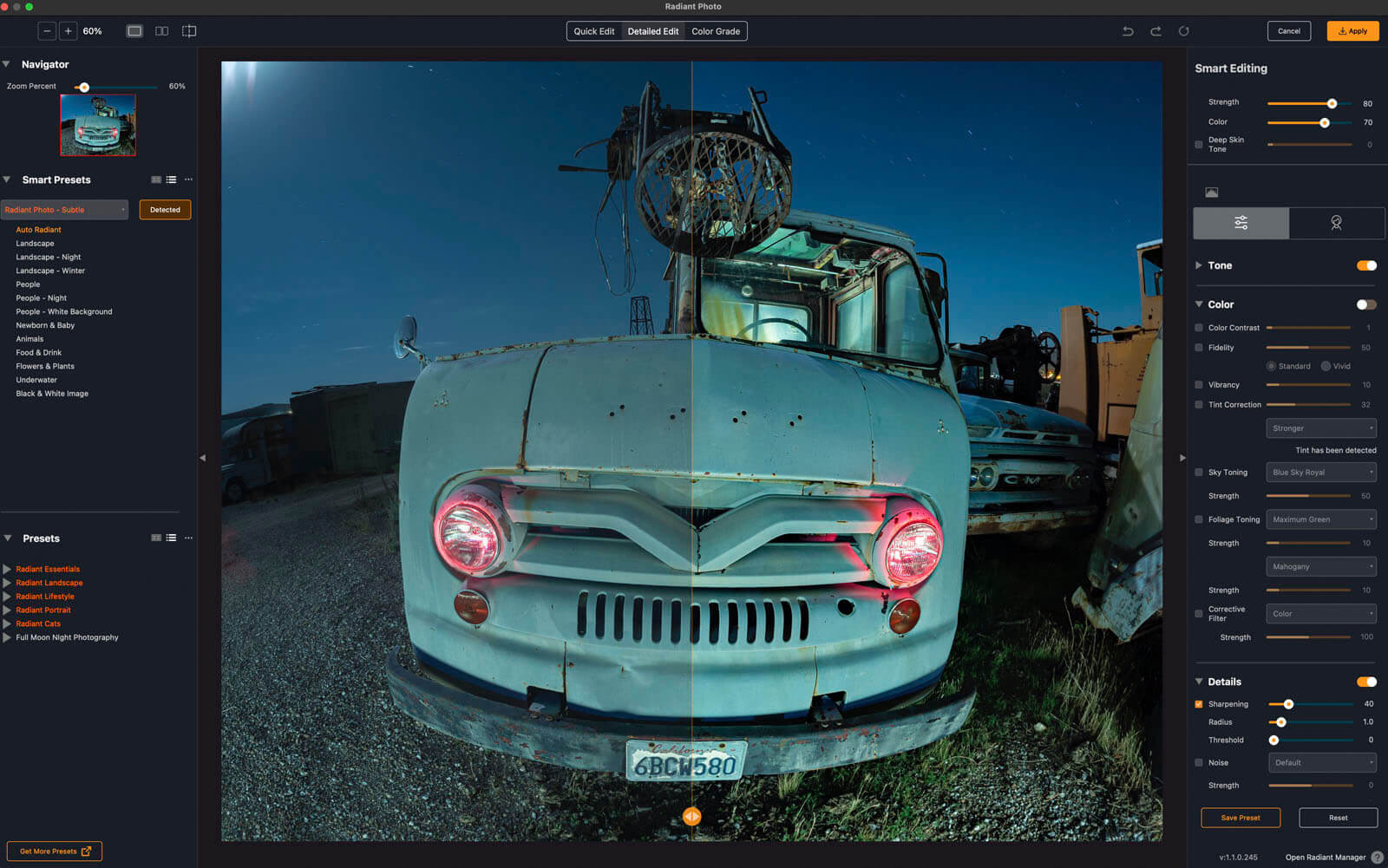 Radiant Photo delivers on the promise of making your image look better with one click while also offering fine-tuning options. Saving your own presets creates an even faster workflow.