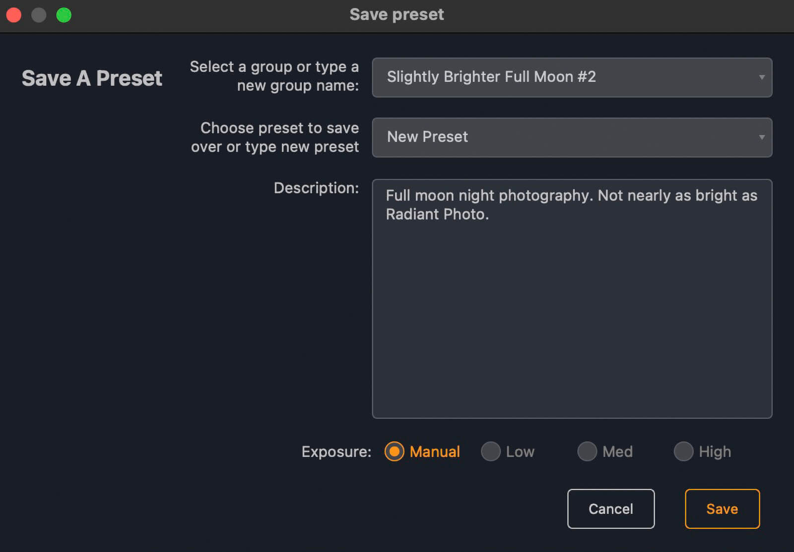 Then, choose a new name for a new preset. Or if you want to change an existing preset, select “choose preset to save over.” Radiant Photo even gives you a chance to offer a further description.