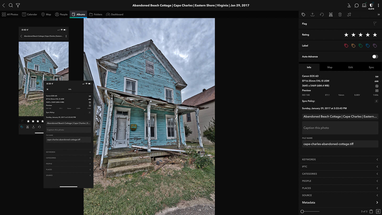 In addition to syncing my photo library, Mylio has numerous organizational tools. These tools allow me to add and edit metadata, categorize, keyword, and more. Any changes I make on one device are synced to every other device in my Mylio account. This lets me cull, rate, and organize on the go. When I get back to my computer, everything syncs and I’m ready to dive into other areas of my workflow.