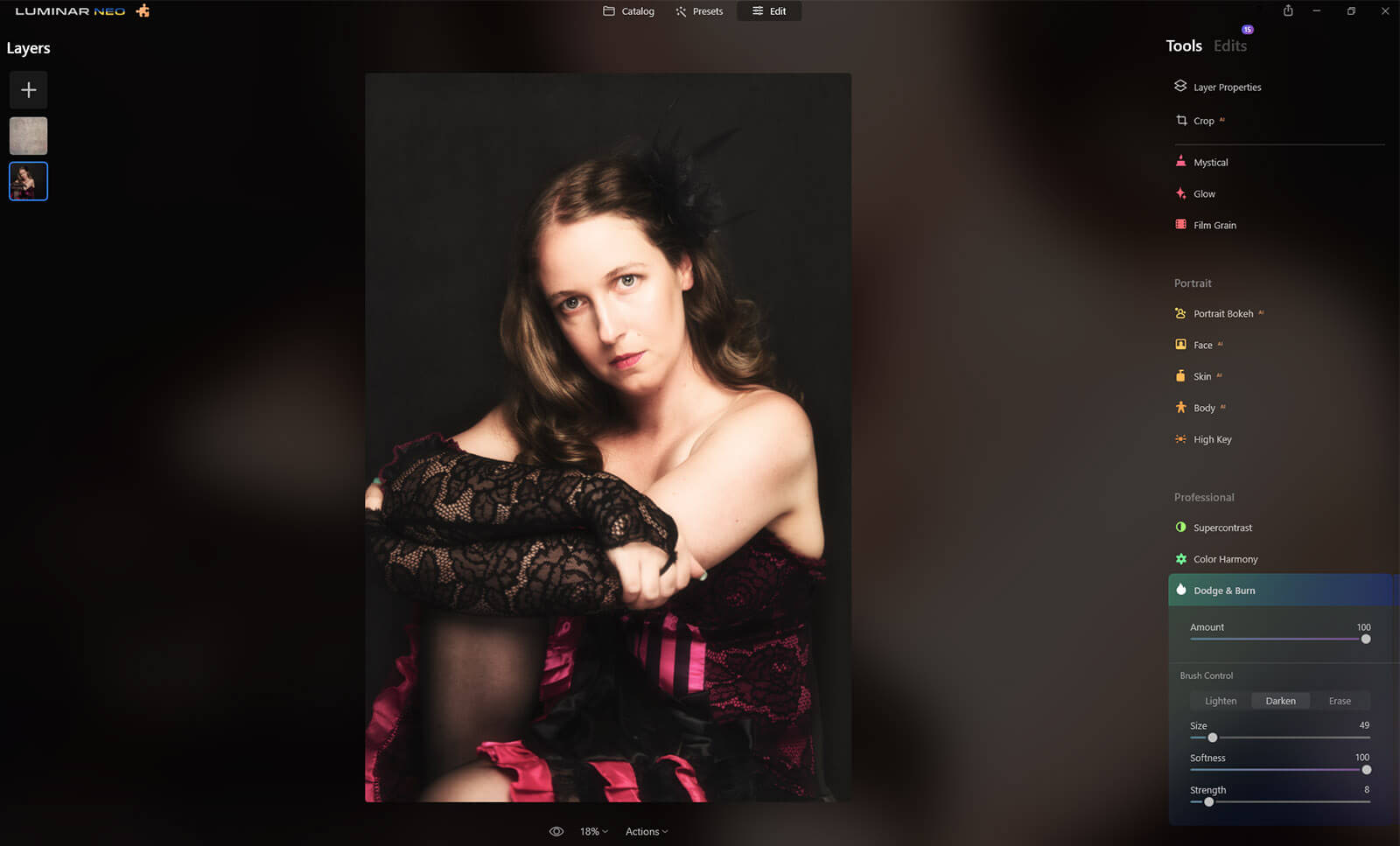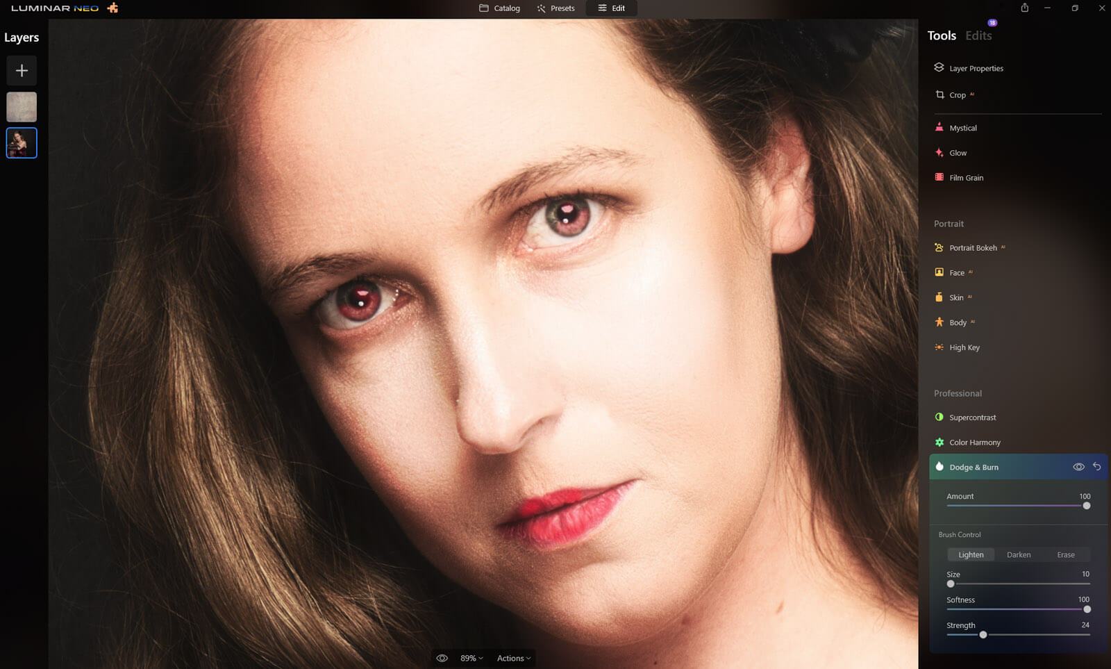 The Dodge and Burn tool in Luminar Neo can be found at the bottom of the Edit module, under the Professional panel of Tools.
