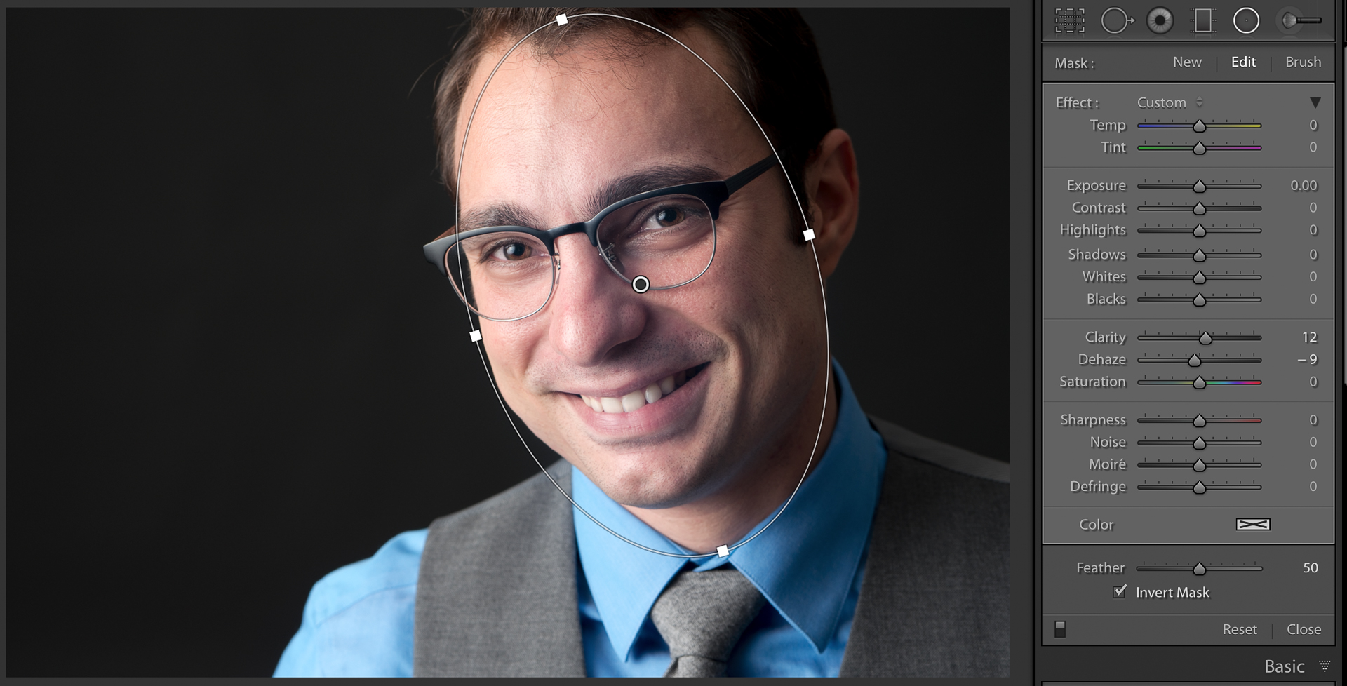 For more finesse, use the Radial Filter positioned over the face only and adjust the Dehaze slider to the left. This lets you keep the deeper colors in the clothing and background but still soften the edges of the shadows on the face.