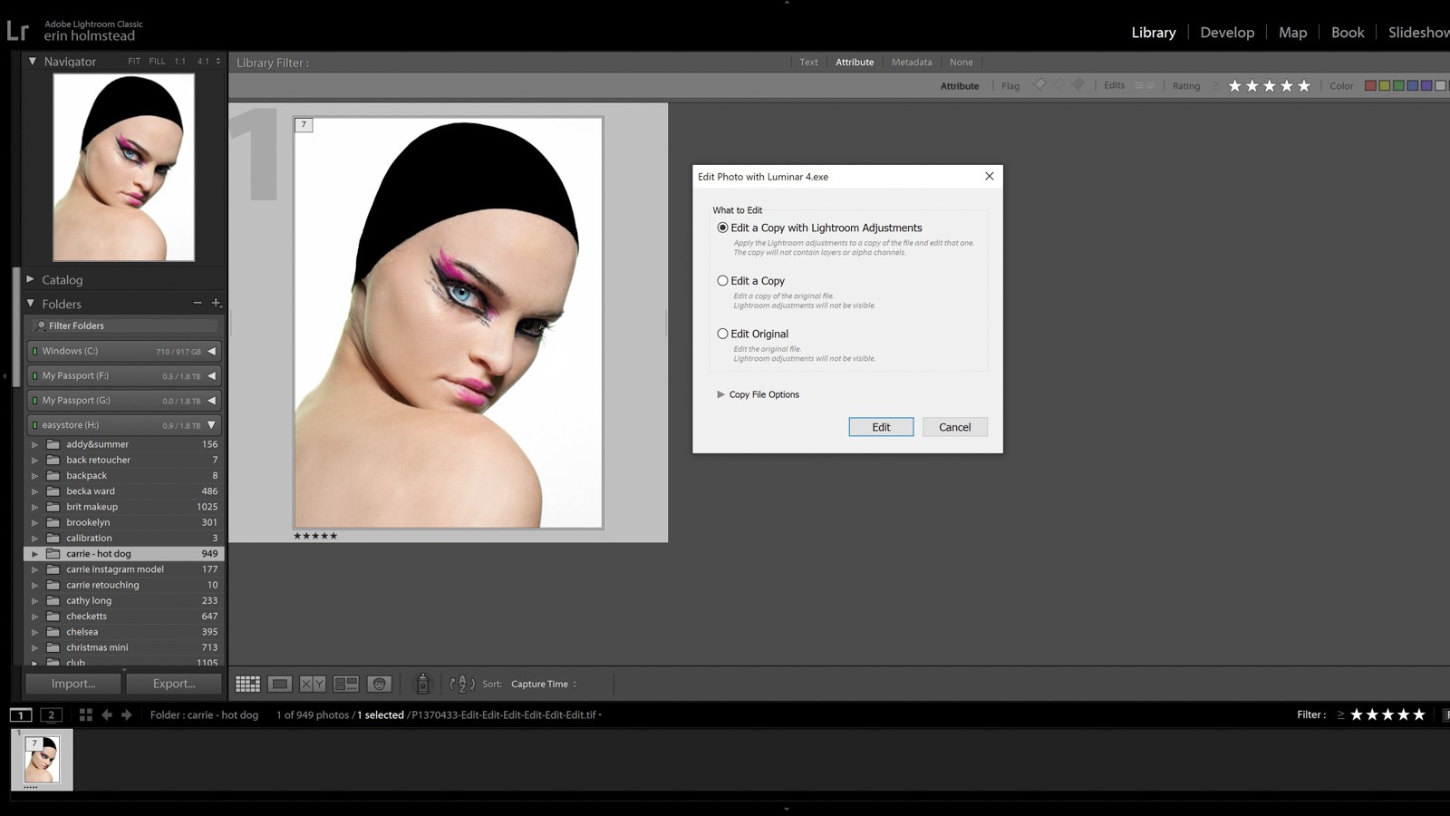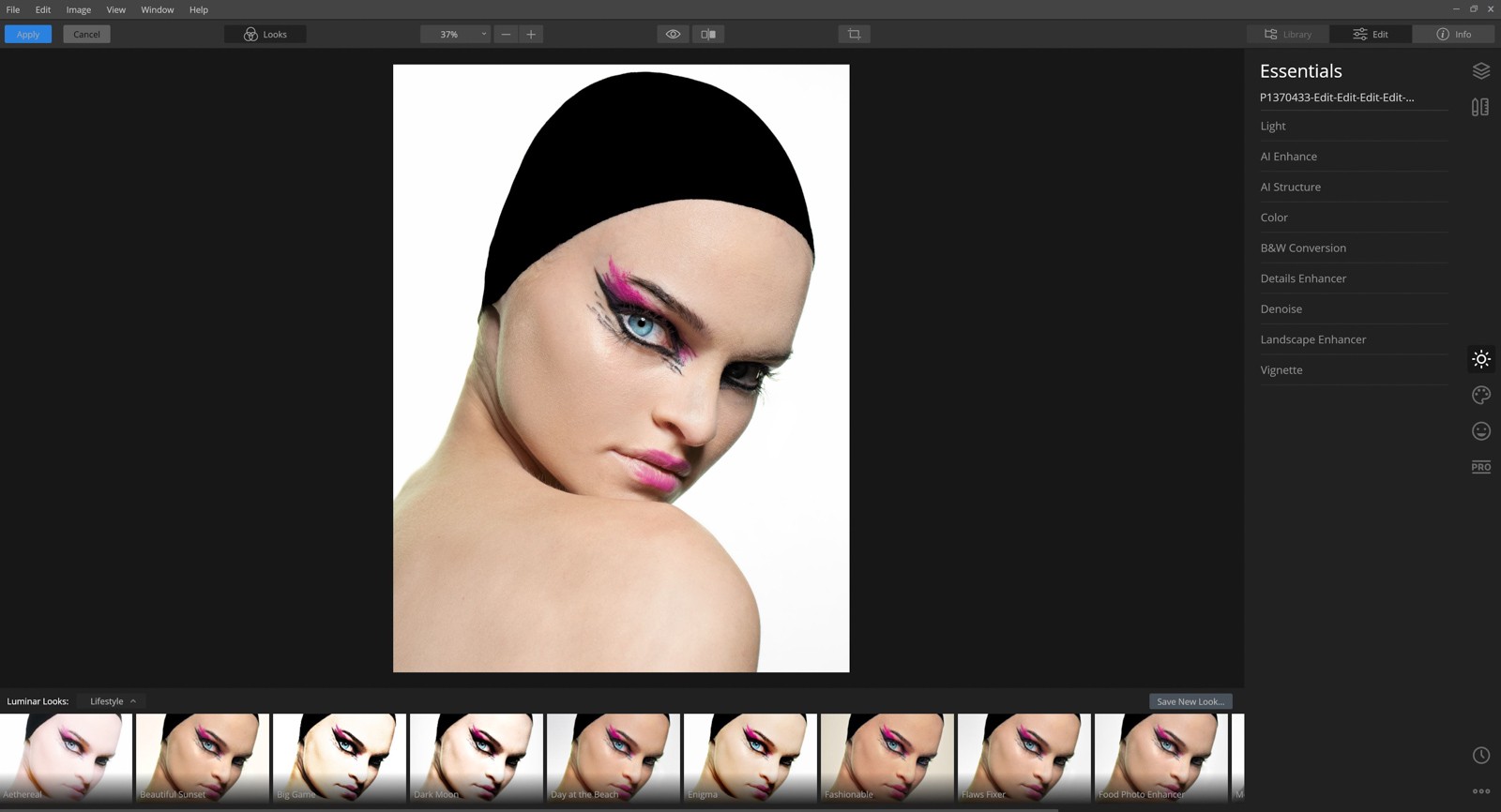 - Click Edit to send the file to Luminar. A new file is added to your Library and stacked with the original in your Library.