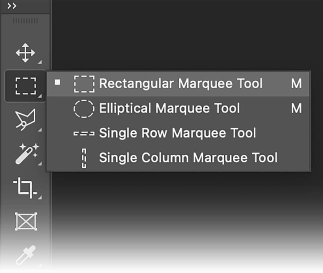 - Single Row or Single Column Marquee tool: Creates a selection that is 1 pixel wide in the shape of a row or column. These two tools are not used often, which is why Adobe didn’t assign the keyboard shortcut M to trigger them.