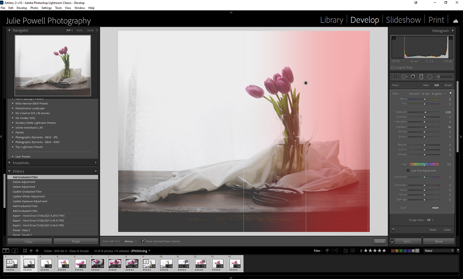 Once you have your desired image in Graduated Filters, simply click Done on the bottom right of the image panel to revert to the main editing panels. You can revisit and re-edit your images but clicking on the Edit area in the Graduated Filter section in Lightroom.