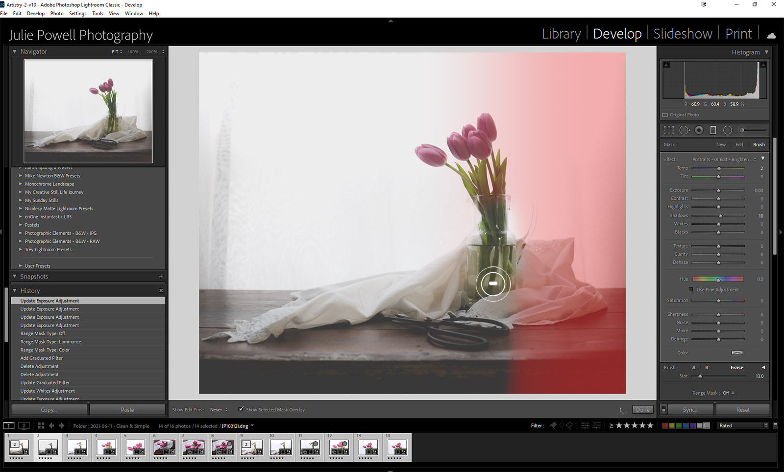 The other unique feature is the brush tool, as opposed to the Adjustment Brush tool. It appears just below the brush icon, but it is the word Brush. This allows you to brush in or out various areas of the mask. Toggle between brush and eraser mode with the Alt key (Option on a Mac), to dial in where you want the mask to appear.