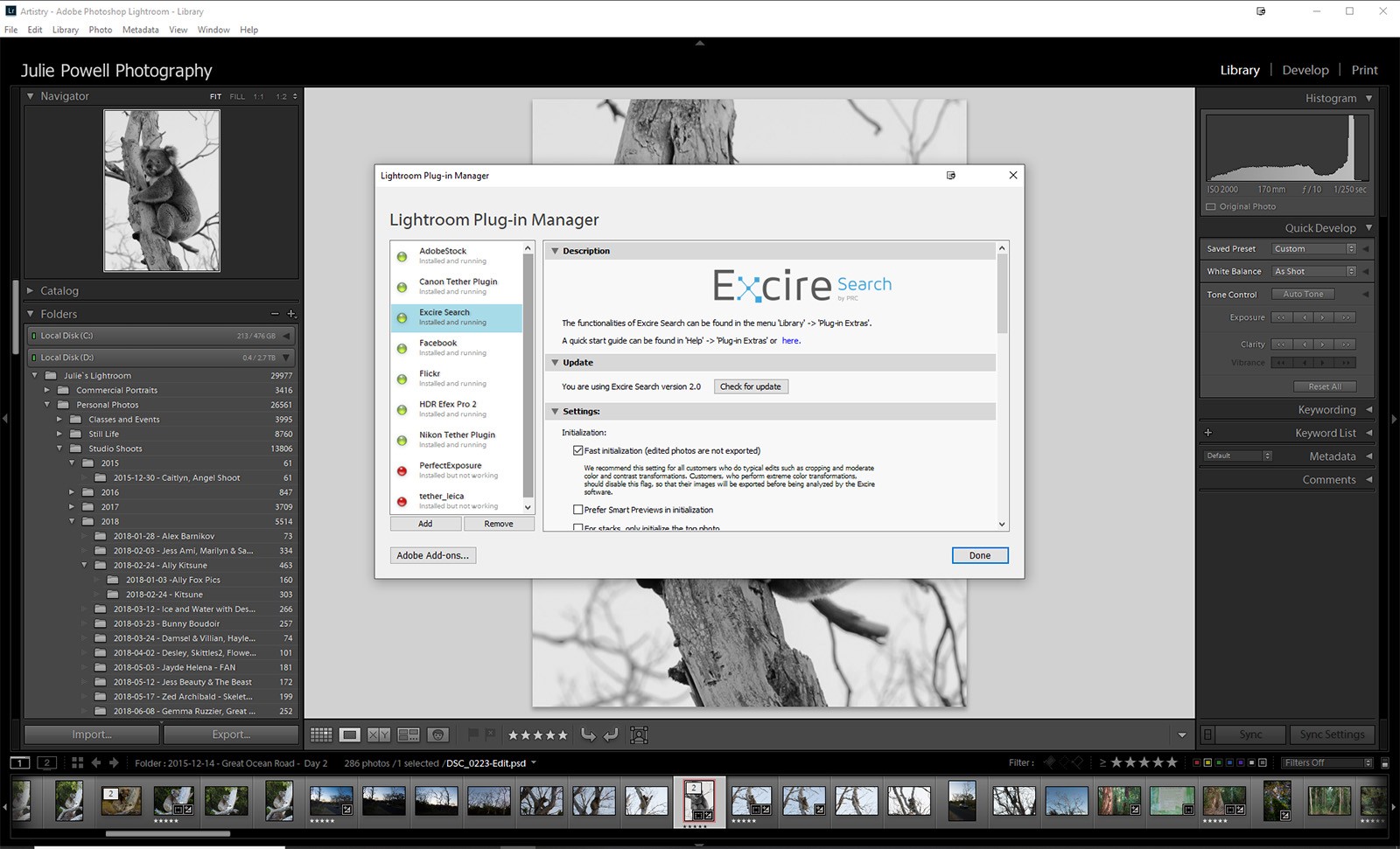 Just go to File > Plugin Manager, and on the bottom left there is a list of all plugins currently loaded (Excire is listed in the screenshot below because I loaded it). If you don’t see Excire Search there, click Add at the bottom and select the excire-search/lrpugin folder to install it. You will be prompted for your email and activation key, or you can select a trial version.