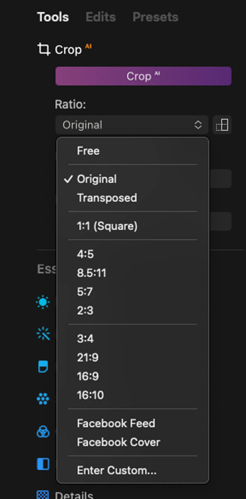 You might want to start out with the Crop tool to see what your options are before you click on that CropAI button. Here you can enter your own custom ratio depending on what you need. The standard crop sizes are just a click away as well.