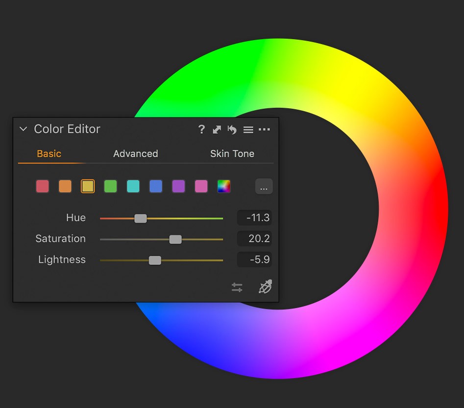 - Basic Color Editor is a simplified interface to Capture One’s renowned color editing tool. Its interface is compact taking up less screen real estate and it’s easy to use. Click on a color then drag to adjust hue, saturation and lightness of use the sliders. More control is still in Capture One Pro 20 in the form of the Advanced Color Editor and the Skin Tone tools.