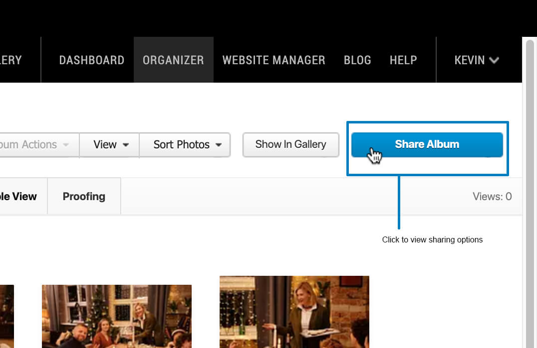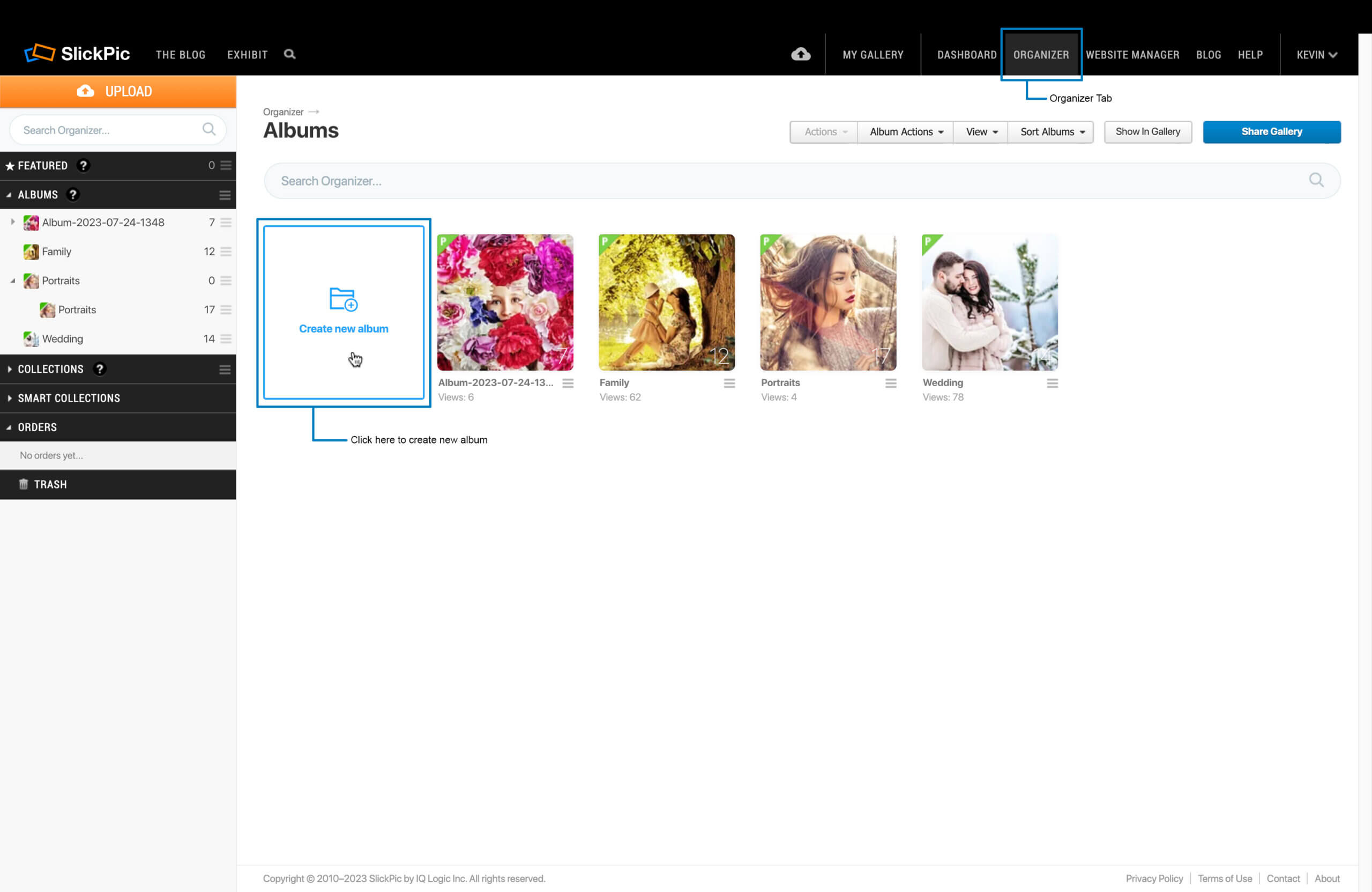 Everything you need to access for securely sharing your holiday photos is within SlickPic’s Organizer! This is where you will create Albums and upload images into them. You can share a single album or collection of Albums within a Gallery.