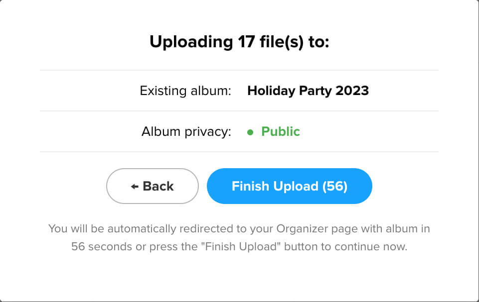 - Click “Finish Upload” to complete this step and be returned to your album. Nice job!