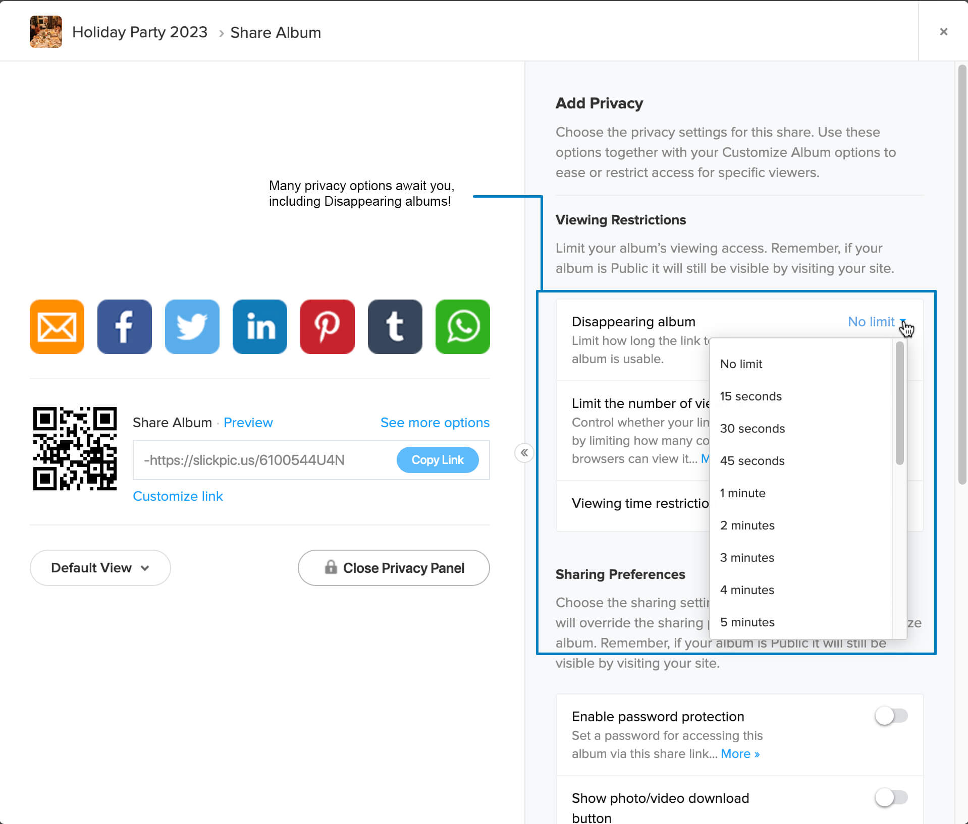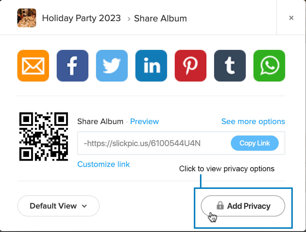 - Before you do that though, you can also click the “Add Privacy” button for many strong privacy options. These range from password protection and limiting the number of viewers, to a powerful feature we call “disappearing albums.”