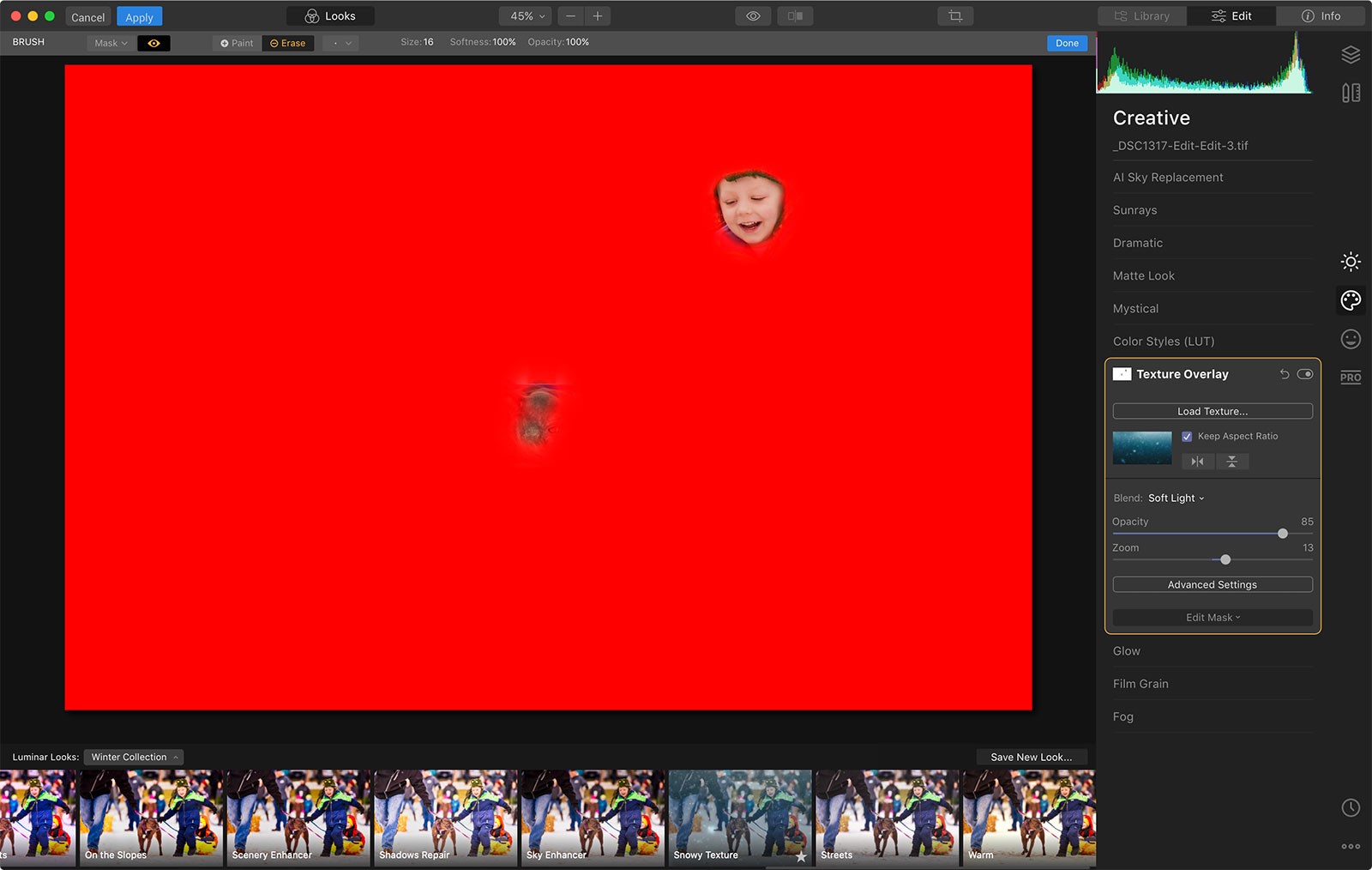From there, I wanted to show a little more of the boy’s face, and not have it so encapsulated with the snow. So I hit the Edit Mask drop-down, and then chose Brush. I then made sure that Erase was selected in the brush toolbar at the top of Luminar (you can also do this by holding down Option on your Mac keyboard, or X on Windows).