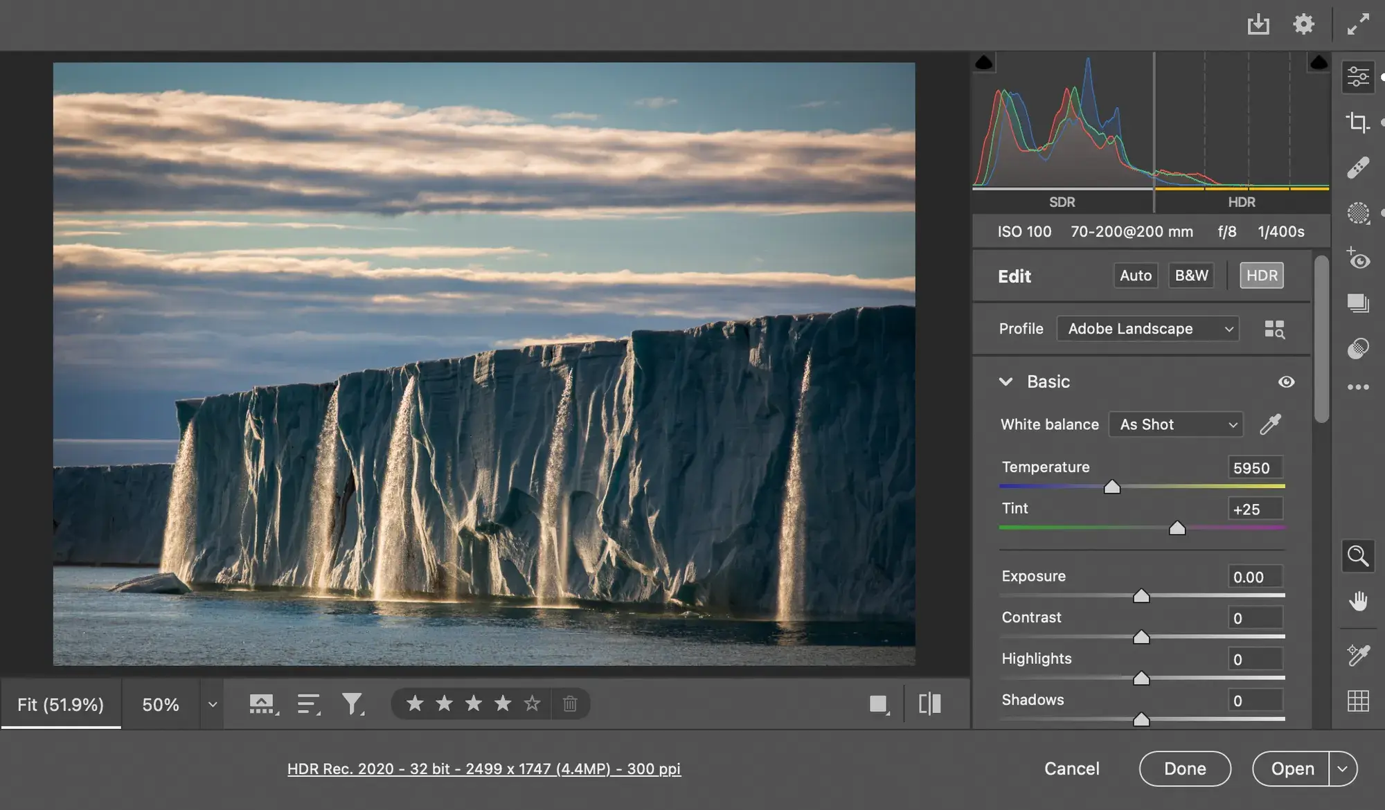 Make the most of the highlights in your images with new HDR support. Enabling HDR will allow you to visualize and edit your highlights in even greater detail on your HDR-compatible display. Now available as a tech preview in Adobe Camera Raw.