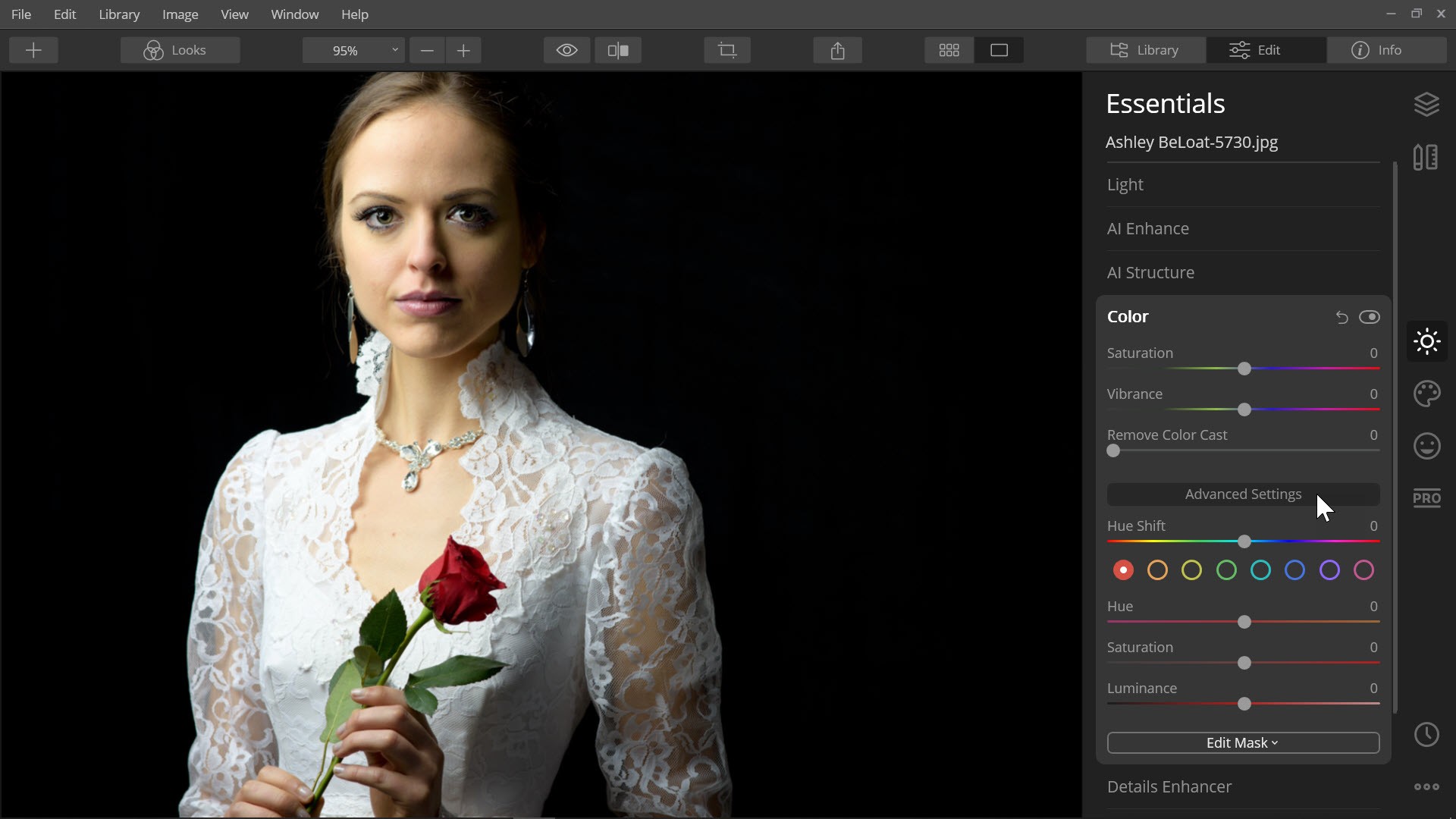 Now, when you need to adjust the color of an image, you can use the Color tool from Essentials. This tool combined three old filters; Saturation and Vibrance, Remove Color Cast and Hue Saturation and Luminance (HSL). With most tools, clicking Advanced Settings reveals more options. These options are used less often so tucking them away under Advanced Settings help add to the clutter-free UI.