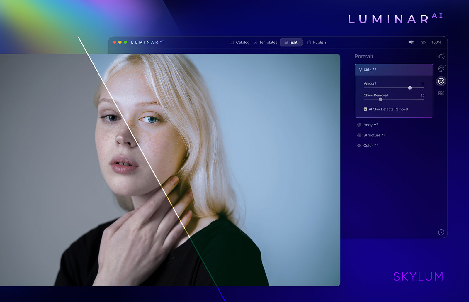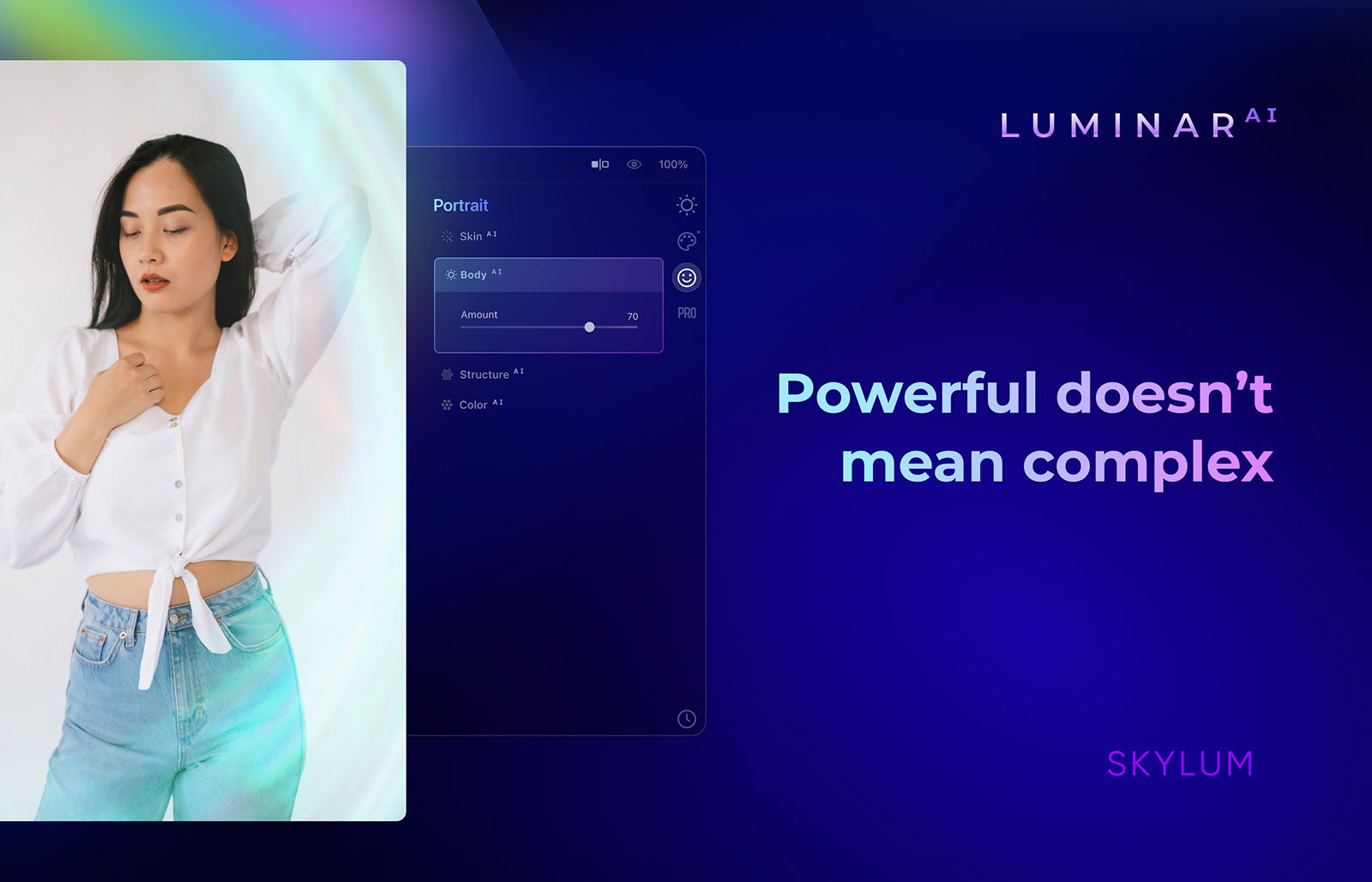 On the portrait side, tools like BodyAI and FaceAI help to gently sculpt and refine a portrait. Eyes can come to life with IrisAI, and blemishes and imperfections can be removed with SkinAI.