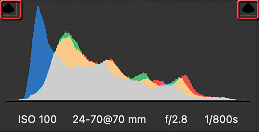 Fortunately, you can easily detect clipping in your photo by turning on the warning indicators. You can the indicators in the upper corners of your histogram in Camera RAW. 100% black is depicted as blue and 100% white as red. Generally speaking, it’s best to avoid full zones but small sections with clipping are usually no problem.