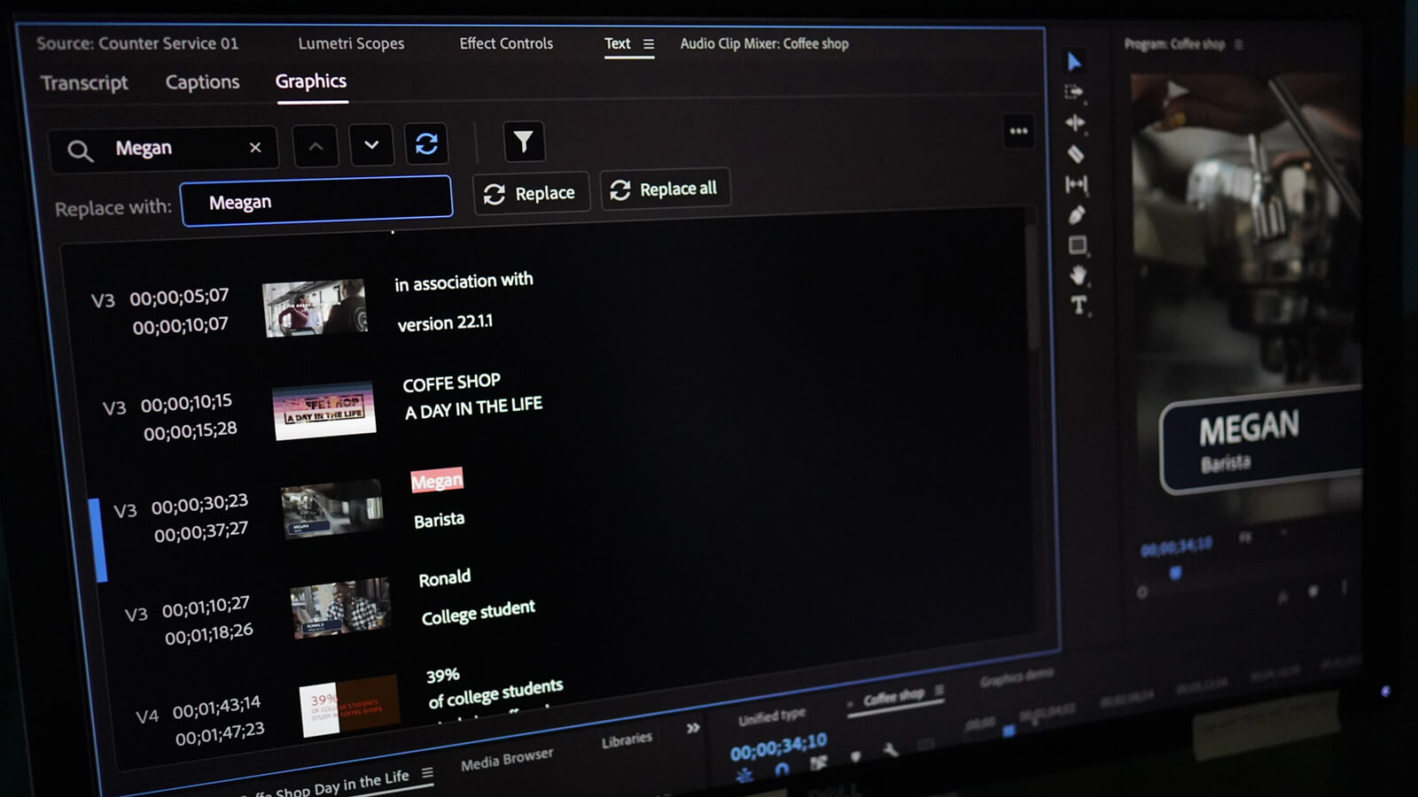 Using the new Text panel, you can now search all of the titles and graphics in a sequence and perform a global Search and Replace, along with spell checking. In addition to text searches, clicking on individual graphics within the Text panel provides an efficient way to navigate sequences.