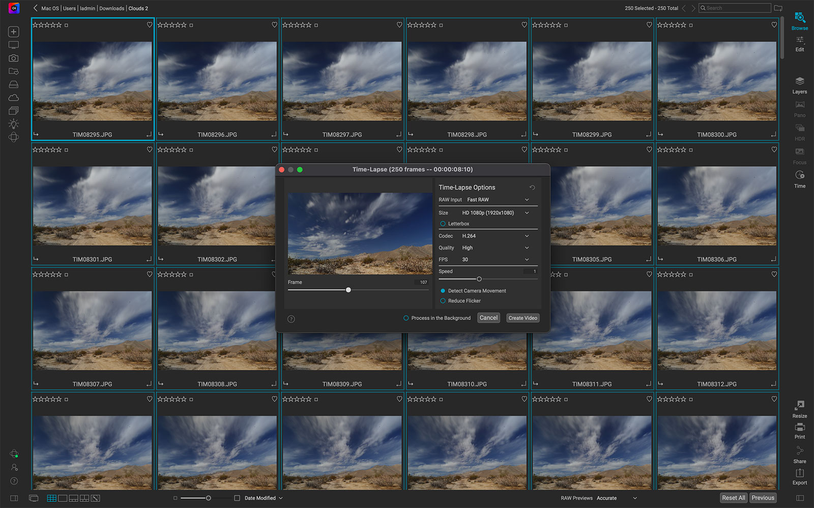 The new time-lapse creation dialog can quickly create time-lapse videos from still photo sequences. You can preview your results right in the dialog and create quick proof versions or high-quality final results. It detects when the camera is bumped and can filter out misaligned frames. It also detects changes in exposure and can even them out automatically, making day to night videos possible. Finally, you can increase or decrease the speed to stretch out short sequences into longer, smooth videos.