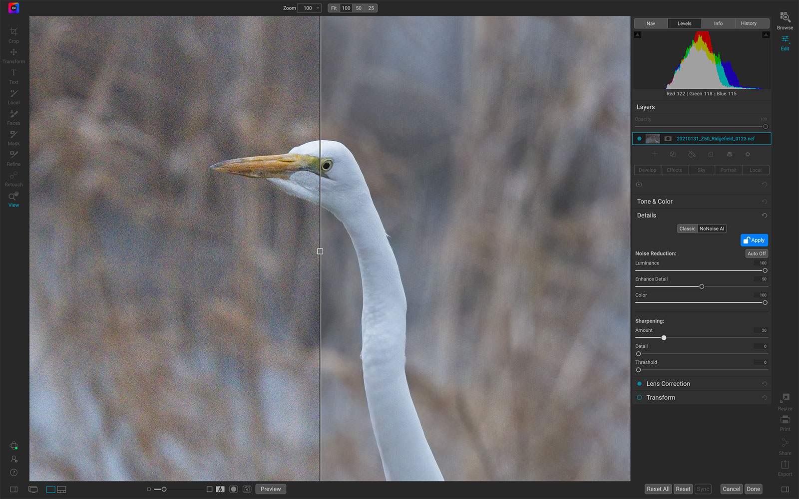 ON1’s AI-based noise removal tool is now built into the core raw processing in ON1 Photo RAW. You can use it on the fly and non-destructively, just like any other raw processing adjustment—no need to create intermediate DNG or TIFF files.