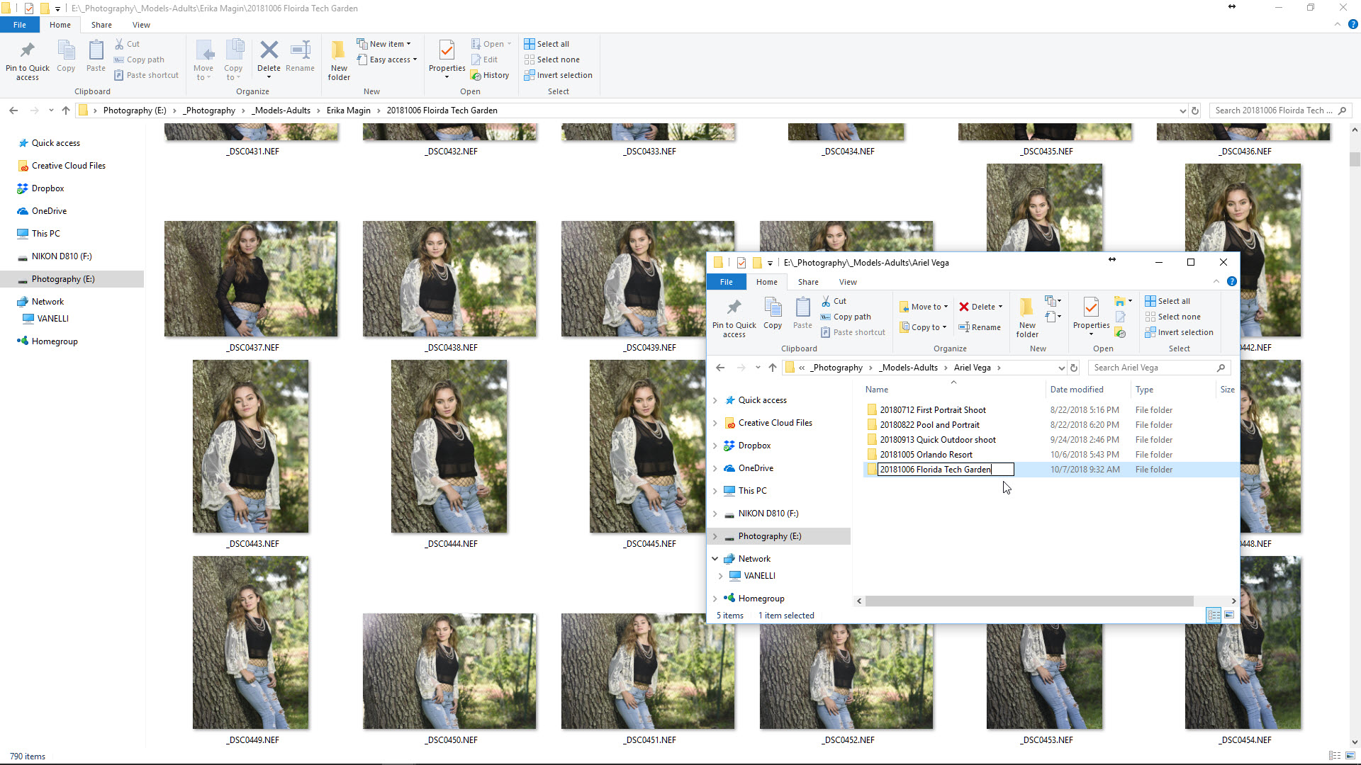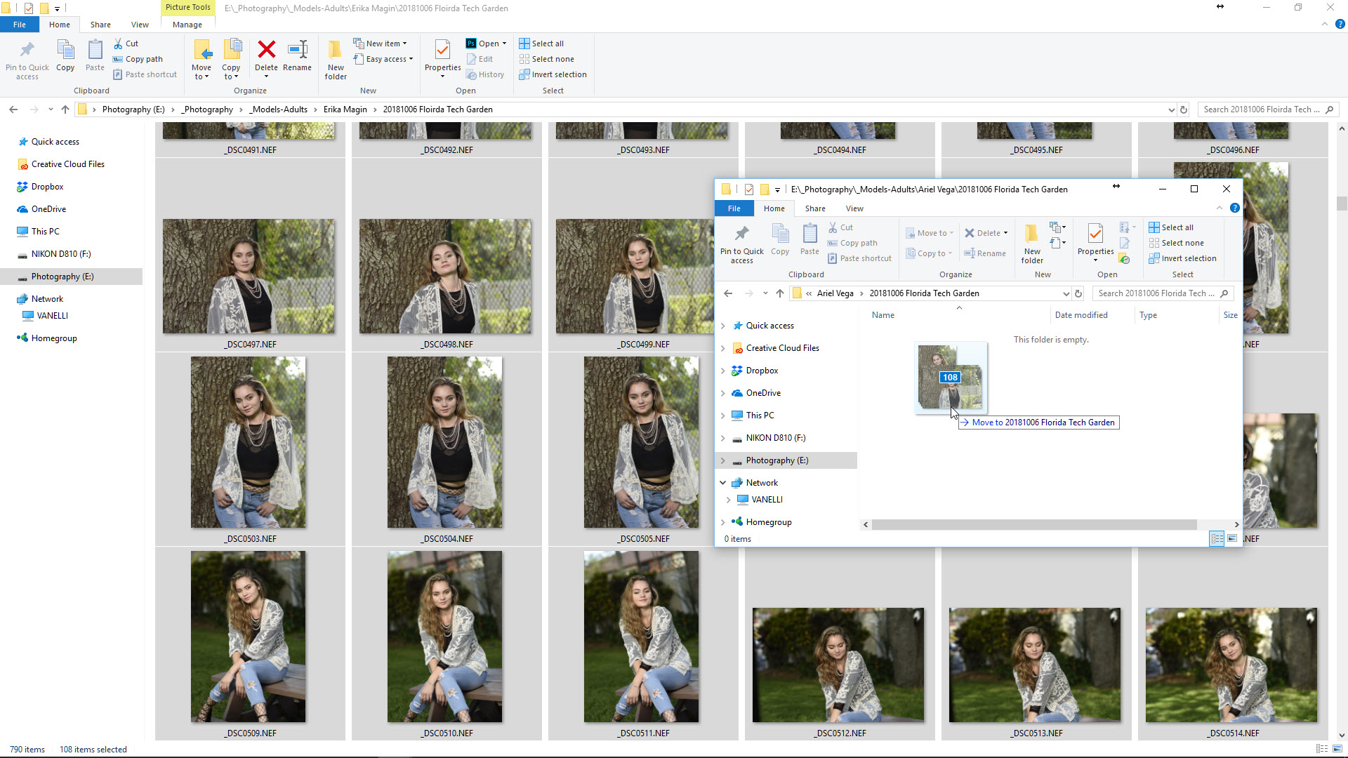 I select Ariel’s photos from one Windows File Explorer window, then move them by dragging and dropping them onto her subfolder in the second Windows File Explorer window. I do this for the remaining models until the only images left in Erika’s subfolder are hers and each model has their own images in their own correct subfolder.